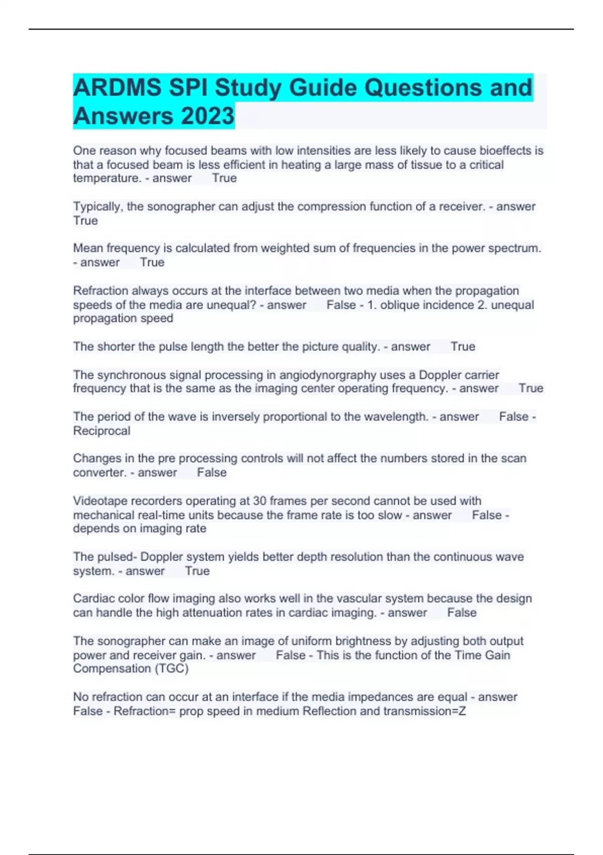 ARDMS SPI Study Guide Questions and Answers 2023 One reason why focused beams with low intensities are less likely to cause bioeffects is that a focused beam is less efficient in heating a large mass of tissue to a critical temperature. True Typically, the sonographer can adjust the compression function of a receiver. True Mean frequency is calculated from weighted sum of frequencies in the power spectrum. True Refraction always occurs at the interface between two media when the propagation speeds of the media are unequal? False - 1. oblique incidence 2. unequal propagation speed The shorter the pulse length the better the picture quality. True The synchronous signal processing in angiodynorgraphy uses a Doppler carrier frequency that is the same as the imaging center operating frequency. True The period of the wave is inversely proportional to the wavelength. False - Reciprocal Changes in the pre processing controls will not affect the numbers stored in the scan converter. False Videotape recorders operating at 30 frames per second cannot be used with mechanical real-time units because the frame rate is too slow False - depends on imaging rate The pulsed- Doppler system yields better depth resolution than the continuous wave system. True Cardiac color flow imaging also works well in the vascular system because the design can handle the high attenuation rates in cardiac imaging. False The sonographer can make an image of uniform brightness by adjusting both output power and receiver gain. False - This is the function of the Time Gain Compensation (TGC) No refraction can occur at an interface if the media impedances are equal False - Refraction= prop speed in medium Reflection and transmission=Z The frame rate of real-time scanners depends on the number of lines used to form one image True Mean frequency corresponds to the fastest moving RBCs within the sample volume at the time of measurement. False Levels of output power and intensity for color flow imaging are generally higher than those for gray-scale imaging. True Linear phased array scanners need no form of mechanical focusing since focusing is performed in electronically. False - slice thickness requires mechanical focusing Filtering widens bandwidth. False Quality assurance evaluations of ultrasound systems should be performed weekly. False - routinely The near zone length should be kept as short as possible False Transit time broadening is a limitation of the FFT processing. True Color Doppler systems are not subject to aliasing. False The pulsed-echo system, the Q factor should be made as large as possible False Length of time that the sound persist Low Q = low SPL= good LARD To transfer sound through a medium, the affected molecules move from one end of the medium to the other. False - microns only The beam diameter is constant in the near zone False - waist The pulse-echo system should have a high Q factor. False. Q factor = length of time sound persists. Optimal low Q factor = short pulse length. Transducers with high bandwidth and low Q factor are desirable. It is not possible to steer an annular phased array electronically. True The period of an ultrasound wave is related to the frequency and is the same regardless whether the wave is pulse or continuous. True Non specular reflectors have physical dimension that are greater than the wavelength. False - they are smaller The color coding of red arteries and blue veins and slow high-resolution frame rates make the identity of arteries and veins in the abdomen direct and easy False abdomen= broad FOV pulse check Focused ultrasound are considered less likely to create bioeffects because they will strike fewer gas bubbles that could potentially cavitate. True A videotape recorder records at a rate of 30 frames/s and therefore cannot be used to record images from a mechanical scanner operating at lower frame rates. False Quality assurance measurements are not required with electronic scanners with digital scan converters False Color flow imaging is unique because it does not have a major problem with high frequency aliasing. False - Color flow imaging is a PW Doppler technique which is also subject to aliasing Interface is the surface forming the boundary between two media having different acoustic impedances. True Asynchronous signal processing in color flow imaging requires the same frequency for both Doppler and gray-scale imaging. False The Doppler angle is not considered in the calculation of velocity in color Doppler imaging False Power spectrum displays a plot of magnitude of individual frequency components versus frequency that converts the complex Doppler signal from time domain into the frequency domain. True Because Doppler signal processing requires more energy, synchronous signal processing always produces Doppler power levels that are higher than those for gray scale imaging. False - synchronous = common transmitter The appearance of negative velocities in a pulsed Doppler display always indicates that red blood cells are moving away from the transducer. False aliasing may occur Side lobe, grating lobe and refraction artifacts all reduce lateral resolution. True