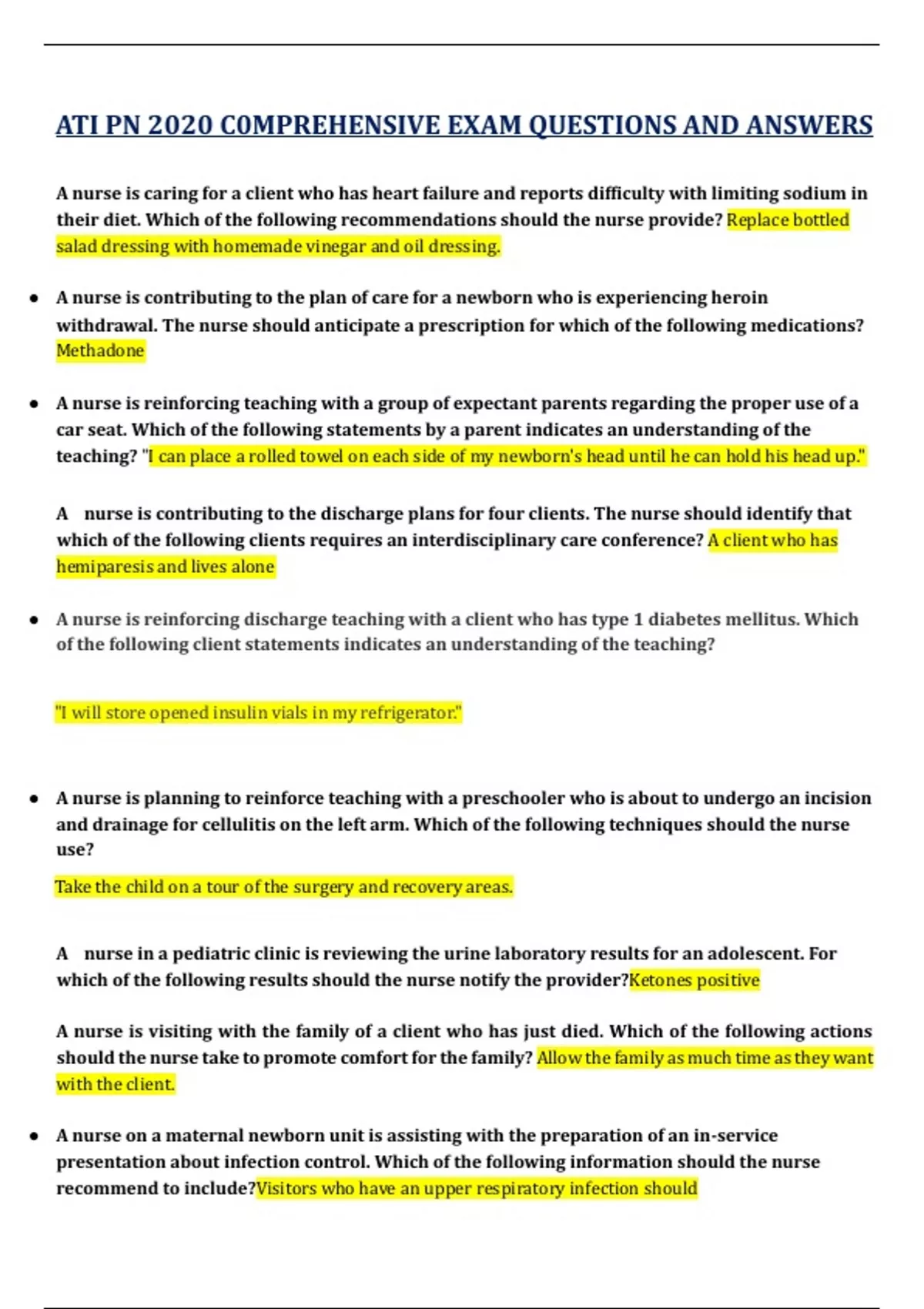 ATI PN 2020 C0MPREHENSIVE EXAM QUESTIONS AND ANSWERS A nurse is caring for a client who has heart failure and reports difficulty with limiting sodium in their diet. Which of the following recommendations should the nurse provide? Replace bottled salad dressing with homemade vinegar and oil dressing. ● A nurse is contributing to the plan of care for a newborn who is experiencing heroin withdrawal. The nurse should anticipate a prescription for which of the following medications? Methadone ● A nurse is reinforcing teaching with a group of expectant parents regarding the proper use of a car seat. Which of the following statements by a parent indicates an understanding of the teaching? "I can place a rolled towel on each side of my newborn's head until he can hold his head up." A nurse is contributing to the discharge plans for four clients. The nurse should identify that which of the following clients requires an interdisciplinary care conference? A client who has hemiparesis and lives alone ● A nurse is reinforcing discharge teaching with a client who has type 1 diabetes mellitus. Which of the following client statements indicates an understanding of the teaching? "I will store opened insulin vials in my refrigerator." ● A nurse is planning to reinforce teaching with a preschooler who is about to undergo an incision and drainage for cellulitis on the left arm. Which of the following techniques should the nurse use? Take the child on a tour of the surgery and recovery areas. A nurse in a pediatric clinic is reviewing the urine laboratory results for an adolescent. For which of the following results should the nurse notify the provider?Ketones positive A nurse is visiting with the family of a client who has just died. Which of the following actions should the nurse take to promote comfort for the family? Allow the family as much time as they want with the client. ● A nurse on a maternal newborn unit is assisting with the preparation of an in-service presentation about infection control. Which of the following information should the nurse recommend to include?Visitors who have an upper respiratory infection should wear a mask. A nurse is collecting data from a client who is postoperative and received hydromorphone 4 mg PO 15 min ago. The client tells the nurse, "My pain level is still 8 on a 0 to 10 scale." Which of the following actions should the nurse take first? Reevaluate the client's response to the medication in 30 min. A nurse in a provider's office is reinforcing teaching with the parents of a school-age child who has an active case of Pediculosis humanus capitis. Which of the following should the nurse include in the teaching? Wash the bed linens in hot water. A nurse from a medical-surgical unit is floating to a postpartum unit. Which of the following clients is an appropriate assignment for the nurse to accept? A client who had a cesarean delivery 24 hr ago A nurse is assisting with the care of a client who is in active labor. Which of the following data is the priority for the nurse to collect following an amniotomy?Fetal heart rate A nurse is assisting in the preparation of an in-service for a group of unit nurses about ethical principles. Which of the following nursing actions should the nurse include as an example of fidelity? A nurse keeps a promise made to a client. A nurse is contributing to the plan of care for a 12-month-old infant following cleft palate repair. Which of the following actions should the nurse include? Maintain elbow restraints on the infant. A nurse administered an IM injection to a client. Which of the following actions should the nurse take to reduce the risk of a needlestick injury? Dispose of the used needle immediately in a sharps container. A nurse is collecting data from a client who has hepatitis A. Whichof the following findings should the nurse expect Abdominal pain A nurse is reinforcing teaching with a client about caring for a new colostomy. Which of the following statements should the nurse make? "You should empty the colostomy bag when it is three-fourths full." ● A charge nurse is explaining the role of a licensed practical nurse to an assistive personnel (AP). Which of the following responsibilities should the charge nurse include? Assessing a client's health status A nurse is assisting with the admission of a client who has mononucleosis. Which of the following isolation precautions should the nurse initiate? Droplet ● A nurse is reinforcing teaching with a client who was diagnosed with diabetes mellitus and requires insulin injections. Which of the following client statements indicates an understanding of the teaching? "I should use an injection site that is 1 inch from the previous site." PAUSE ● A nurse is reinforcing teaching about home safety with the parent of an 8-month-old infant. Which of the following statements by the parent indicates an understanding of the teaching? "I will keep the door to the bathroom closed." ● A nurse is collecting data from a newly admitted client. Which of the following questions should the nurse ask to assess the client's abstract thinking ability? "What does the phrase 'butterflies in my stomach' mean?" ● A nurse is collecting health history data from a client who has hemorrhoids. Which of the following findings should the nurse expect? Chronic constipation ● A nurse is reviewing client care assignments prior to the beginning of a shift. Which of the following client assignments should the nurse identify as being outside the scope of practice for an LPN? A client who has a new onset of chest pain A nurse is checking the home environment of a client for safety hazards. Which of the following items require intervention by the nurse? The television set is turned to a loud volume. The chair sits too low A nurse is reinforcing teaching about home care with the parents of a child who has a seizure disorder. Which of the following instructions should the nurse include? Call EMS if a se
