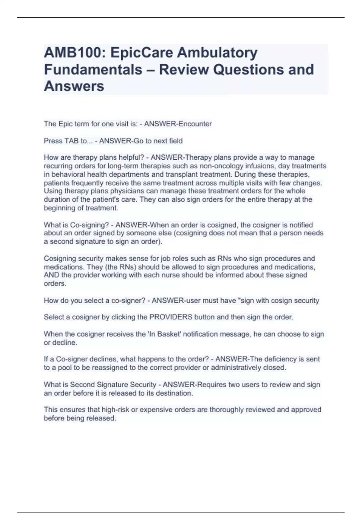 AMB100: EpicCare Ambulatory Fundamentals – Review Questions and AnswersAMB100: EpicCare Ambulatory Fundamentals – Review Questions and Answers The Epic term for one visit is: - ANSWER-Encounter Press TAB to... - ANSWER-Go to next field How are therapy plans helpful? - ANSWER-Therapy plans provide a way to manage recurring orders for long-term therapies such as non-oncology infusions, day treatments in behavioral health departments and transplant treatment. During these therapies, patients frequently receive the same treatment across multiple visits with few changes. Using therapy plans physicians can manage these treatment orders for the whole duration of the patient's care. They can also sign orders for the entire therapy at the beginning of treatment. What is Co-signing? - ANSWER-When an order is cosigned, the cosigner is notified about an order signed by someone else (cosigning does not mean that a person needs a second signature to sign an order). Cosigning security makes sense for job roles such as RNs who sign procedures and medications. They (the RNs) should be allowed to sign procedures and medications, AND the provider working with each nurse should be informed about these signed orders. How do you select a co-signer? - ANSWER-user must have "sign with cosign security Select a cosigner by clicking the PROVIDERS button and then sign the order. When the cosigner receives the 'In Basket' notification message, he can choose to sign or decline. If a Co-signer declines, what happens to the order? - ANSWER-The deficiency is sent to a pool to be reassigned to the correct provider or administratively closed. What is Second Signature Security - ANSWER-Requires two users to review and sign an order before it is released to its destination. This ensures that high-risk or expensive orders are thoroughly reviewed and approved before being released.