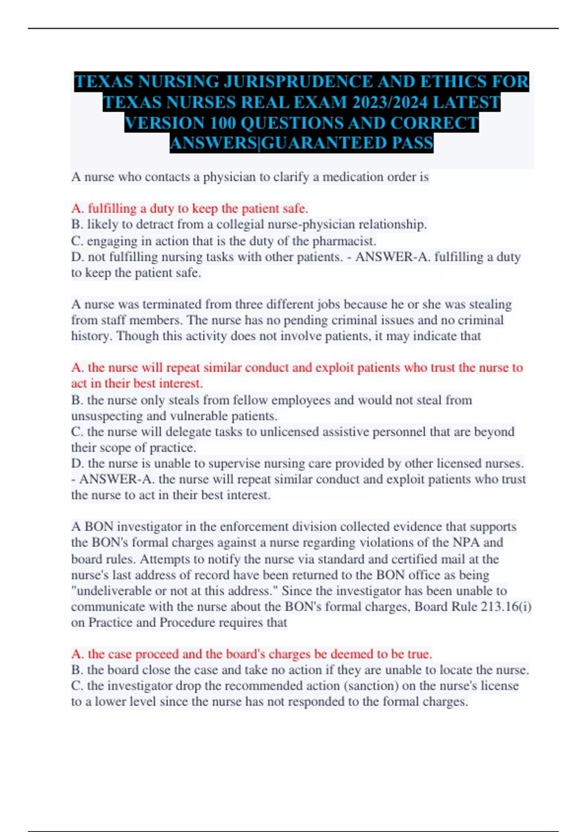 TEXAS NURSING JURISPRUDENCE AND ETHICS FOR TEXAS NURSES REAL EXAM 2023/2024 LATEST VERSION 100 QUESTIONS AND CORRECT ANSWERS|GUARANTEED PASS