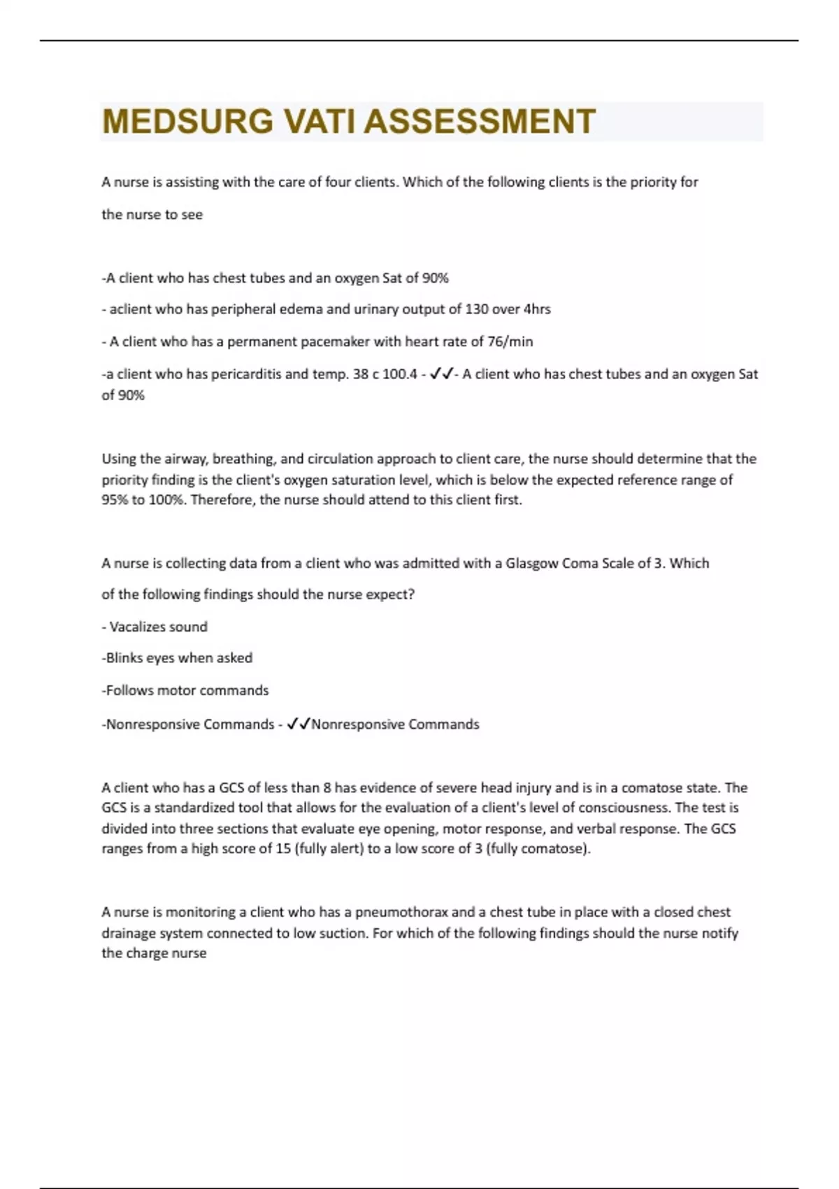 A nurse is assisting with the care of four clients. Which of the following clients is the priority for the nurse to see -A client who has chest tubes and an oxygen Sat of 90% - aclient who has peripheral edema and urinary output of 130 over 4hrs - A client who has a permanent pacemaker with heart rate of 76/min -a client who has pericarditis and temp. 38 c 100.4 - - A client who has chest tubes and an oxygen Sat of 90% Using the airway, breathing, and circulation approach to client care, the nurse should determine that the priority finding is the client's oxygen saturation level, which is below the expected reference range of 95% to 100%. Therefore, the nurse should attend to this client first. A nurse is collecting data from a client who was admitted with a Glasgow Coma Scale of 3. Which of the following findings should the nurse expect? - Vacalizes sound -Blinks eyes when asked -Follows motor commands -Nonresponsive Commands - Nonresponsive Commands A client who has a GCS of less than 8 has evidence of severe head injury and is in a comatose state. The GCS is a standardized tool that allows for the evaluation of a client's level of consciousness. The test is divided into three sections that evaluate eye opening, motor response, and verbal response. The GCS ranges from a high score of 15 (fully alert) to a low score of 3 (fully comatose). A nurse is monitoring a client who has a pneumothorax and a chest tube in place with a closed chest drainage system connected to low suction. For which of the following findings should the nurse notify the charge nurse- Fluctation of the water level in the water seal chamber -constant bubling in the suction control chamber - periodic bubbling in the water seal chamber - Persistent bubbling in the water seal chamber - - Persistent bubbling in the water seal chambe