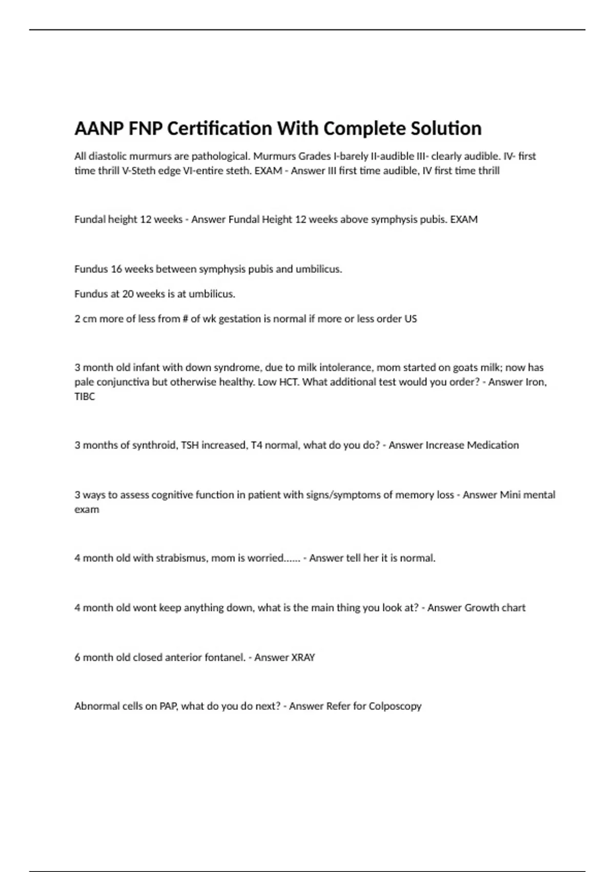 All diastolic murmurs are pathological. Murmurs Grades I-barely II-audible III- clearly audible. IV- first time thrill V-Steth edge VI-entire steth. EXAM - Answer III first time audible, IV first time thrill Fundal height 12 weeks - Answer Fundal Height 12 weeks above symphysis pubis. EXAM Fundus 16 weeks between symphysis pubis and umbilicus. Fundus at 20 weeks is at umbilicus. 2 cm more of less from # of wk gestation is normal if more or less order US 3 month old infant with down syndrome, due to milk intolerance, mom started on goats milk; now has pale conjunctiva but otherwise healthy. Low HCT. What additional test would you order? - Answer Iron, TIBC 3 months of synthroid, TSH increased, T4 normal, what do you do? - Answer Increase Medication 3 ways to assess cognitive function in patient with signs/symptoms of memory loss - Answer Mini mental exam 4 month old with strabismus, mom is worried...... - Answer tell her it is normal. 4 month old wont keep anything down, what is the main thing you look at? - Answer Growth chart 6 month old closed anterior fontanel. - Answer XRAY Abnormal cells on PAP, what do you do next? - Answer Refer for Colposcopy CAGE ACRONYM - Answer Cut down Annoyed by criticism Guilty about drinking Eye opener drink Causes of tachycardia - Answer Fever Anemia Hypotension Cranial nerves responsible for extraocular eye movements - Answer CN 3,4,6 Definition of metabolic syndrome - Answer cluster of conditions that increase risk of heart disease, stroke, diabetes. diagnose trichomoniasis - Answer wet prep Elderly presents with atrophic vaginitis, small uterus, palpable 4x5 ovary, what do you do next? - Answer Pelvic US Epistaxis is most common in the area of the nose known as kiesselbachs triangle, where is this located? - Answer Anterior septum Definitive diagnosis of acute bacterial prostatitis - Answer urinalysis and culture GERD treatment - Answer H2 is first line, give hs Grade 3 cells on Pap, treatment? - Answer LEEP excision Fingernail hematoma treatment? - Answer drill hole and drain blood? Increased risk of ectopic pregnancy - Answer Salpingitis, or history of abortion, PID, Koplick spots - Answer Measles (rubeola). Grains of salt lesions inside mouth in Measles Koplick spots - Answer Measles (rubeola). Grains of salt lesions inside mouth in Measles Legg-Calve-Perthes Disease - Answer Avascular necrosis of the proximal femoral head Lipid level of 1500, increased risk for? - Answer Pancreatitis Low HGB, Low HCT, High MCV indicates what? - Answer Macrocytic anemia, B12 Def Man with BPH, prostate feels on digital exam? - Answer Enlarged, symmetrical, smooth Man with HTN, CAD, present femoral pulses but absent pedal - Answer Arterial Insufficiency McMurray's Sign (+) palpable or audible click while extending with varus stress - Answer Meniscus tears Lachman's Test - Answer pivot shift test (ACL tear) Newborn with foot turned in, what do you do? - Answer refer to orthopedist Osgood-Schlatter disease - Answer Knee pain. inflammation or irritation of the tibia at its point of attachment with the patellar tendon Patient forgot to start Thanksgiving dinner and husband states she has trouble remembering tasks and trouble with organization. What is this indicative of? - Answer Alzheimer's Pt has Barretts Esophagus, insurance no longer covers GI who was treating condition. Pt at FNP office wanting refill prescriptions. What do you do? - Answer Refer to oncologist Pt presents with rash on shoulder, erythematous maculopapular rash with center clearing and scaling? - Answer Tinea Corporis Pt presents with "bag of worms:, indicates? - Answer Varicocele Pt with atopic dermatitis, look for what other diseases? - Answer Asthma Pt with bleeding after menopause - Answer endometrial biopsy, need to screen for cancer Pt with hx of PID, increased rick for? - Answer Infertility Pt with HIV took high potency anti viral treatments and CD4 is >400, what does this indicate? - Answer This is good. Want higher than 350 Pt with hx of htn and stroke, now having memory loss. What does this indicate? - Answer Vascular dementia Pregnant teacher with exposure to 5ths disease (SLAP CHEEK), what risk is there to the fetus? - Answer slap cheek, PVB19, rash hands / feet Fetal death and birth defects Quick assessment of patients fall risk? Timed Get up and Go - Answer Timed Get up and Go Red beefy tongue? - Answer pernicious anemia Rotator cuff injury presentation - Answer disturbs sleep, arm weakness, dull ache Shingles near eye - Answer immediate referral to ophthalmology Signs and symptoms of Roseola (6ths disease) ? - Answer Viral infection Can result in a maculopapular rash, but up to 70% of cases proceed without the rash stage -Usually accompanied by a high fever (41°C or 105°F) that comes on quickly and lasts up to 3 days followed by rash -Seizures may occur during this period. -On the fourth day, the fever disappears and the rash appears, first on chest and trunk, then less prominently on the face and limbs. -High fever, pink flat or raised rash Treatment for chronic alcoholism: - Answer 12 step program Treatment for Gonorrhea? - Answer Rocephin 250mg IMx1 plus Azithromycin 1 gm orally x1 to cover chlamydia. , or doxy 100 mg BID x7d. Green colored vaginal discharge, friable cervix. EXAM Report to health department Young female want birth control, forgets to take pills, does not want to get pregnant for at least 5 years: - Answer IUD Basal cell cancer - Answer Waxy, pearly, telangiectasia, ulcer center lesion -most common type of skin cancer caused by UV exposure. Metastatic is rare Actinic Keratosis - Answer Scaly red to yellow located in sun exposed area -a precancerous skin growth that occurs on sun-damaged skin Actinic Keratosis - Answer Numerous round dry pink to red areas. Scaly red to yellow located in sun exposed area -a pre squamous cell carcinoma occurs on sun-damaged skin biopsy cryo or 5fu cream subungual hematoma tx - Answer Make a hole and drain the blood Moderate acne treatme