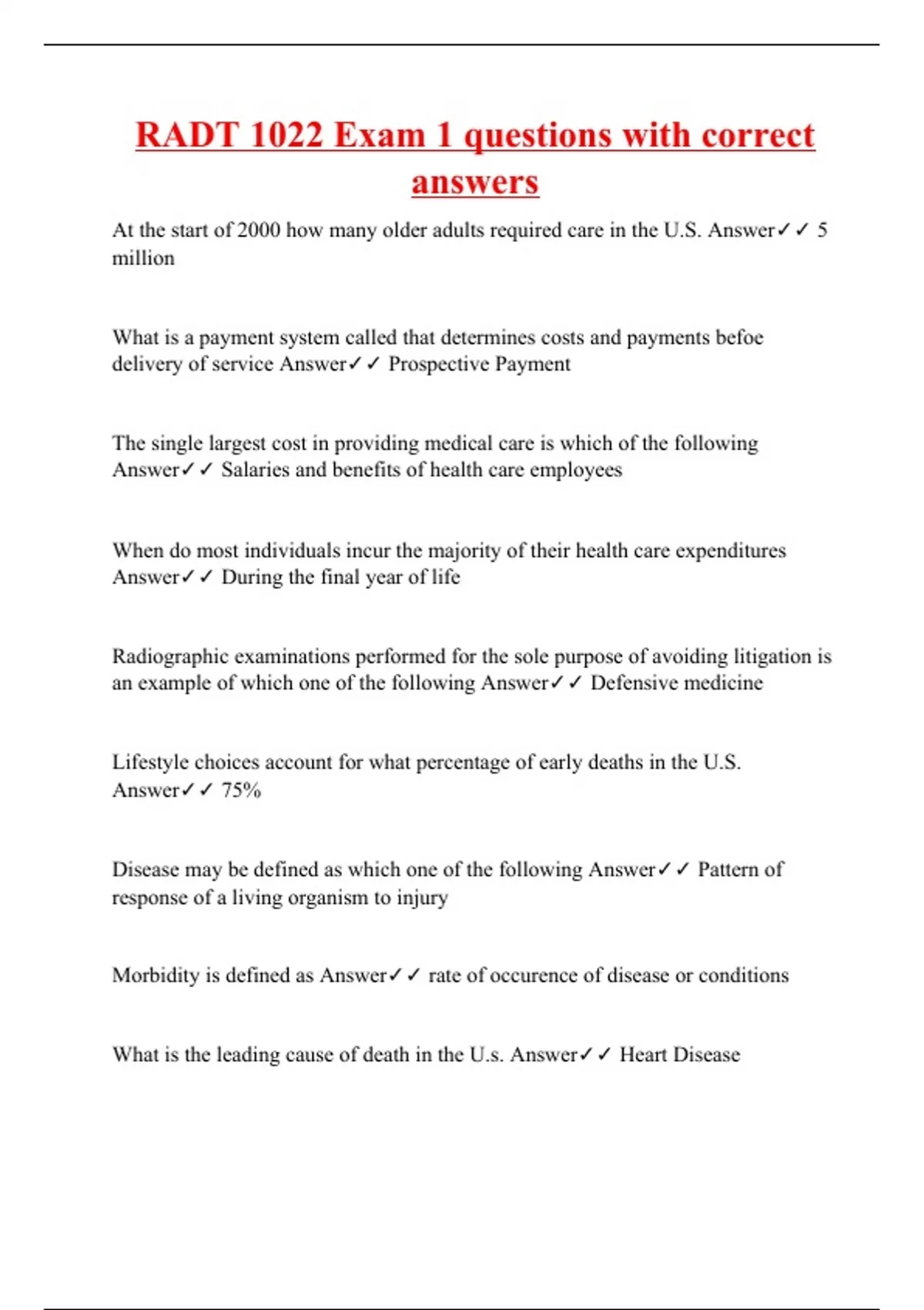 At the start of 2000 how many older adults required care in the U.S. Answer 5 million What is a payment system called that determines costs and payments befoe delivery of service Answer Prospective Payment The single largest cost in providing medical care is which of the following Answer Salaries and benefits of health care employees When do most individuals incur the majority of their health care expenditures Answer During the final year of life Radiographic examinations performed for the sole purpose of avoiding litigation is an example of which one of the following Answer Defensive medicine Lifestyle choices account for what percentage of early deaths in the U.S. Answer 75% Disease may be defined as which one of the following Answer Pattern of response of a living organism to injury