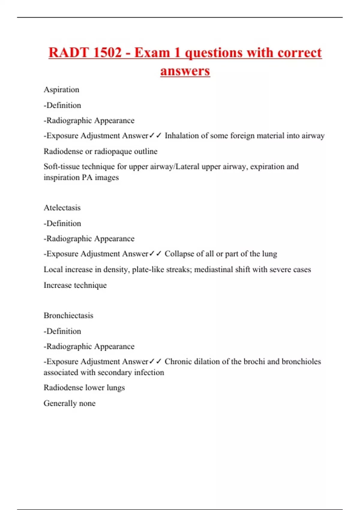 Aspiration -Definition -Radiographic Appearance -Exposure Adjustment Answer Inhalation of some foreign material into airway Radiodense or radiopaque outline Soft-tissue technique for upper airway/Lateral upper airway, expiration and inspiration PA images Atelectasis -Definition -Radiographic Appearance -Exposure Adjustment Answer Collapse of all or part of the lung Local increase in density, plate-like streaks; mediastinal shift with severe cases Increase technique Bronchiectasis -Definition -Radiographic Appearance -Exposure Adjustment Answer Chronic dilation of the brochi and bronchioles associated with secondary infection Radiodense lower lungs Generally none