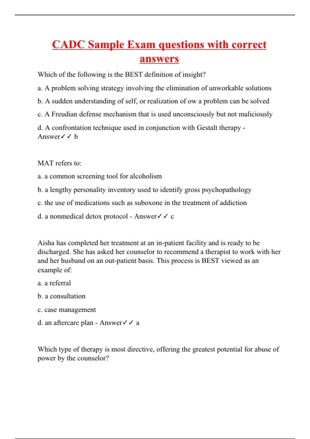 Which of the following is the BEST definition of insight? a. A problem solving strategy involving the elimination of unworkable solutions b. A sudden understanding of self, or realization of ow a problem can be solved c. A Freudian defense mechanism that is used unconsciously but not maliciously d. A confrontation technique used in conjunction with Gestalt therapy - Answer b MAT refers to: a. a common screening tool for alcoholism b. a lengthy personality inventory used to identify gross psychopathology c. the use of medications such as suboxone in the treatment of addiction d. a nonmedical detox protocol - Answer c Aisha has completed her treatment at an in-patient facility and is ready to be discharged. She has asked her counselor to recommend a therapist to work with her and her husband on an out-patient basis. This process is BEST viewed as an example of: a. a referral b. a consultation c. case management d. an aftercare plan - Answer a Which type of therapy is most directive, offering the greatest potential for abuse of power by the counselor? a. Adlerian