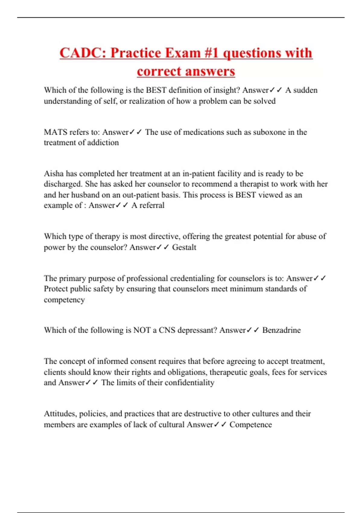 Which of the following is the BEST definition of insight? Answer A sudden understanding of self, or realization of how a problem can be solved MATS refers to: Answer The use of medications such as suboxone in the treatment of addiction Aisha has completed her treatment at an in-patient facility and is ready to be discharged. She has asked her counselor to recommend a therapist to work with her and her husband on an out-patient basis. This process is BEST viewed as an example of : Answer A referral Which type of therapy is most directive, offering the greatest potential for abuse of power by the counselor? Answer Gestalt The primary purpose of professional credentialing for counselors is to: Answer Protect public safety by ensuring that counselors meet minimum standards of competency Which of the following is NOT a CNS depressant? Answer Benzadrine The concept of informed consent requires that before agreeing to accept treatment, clients should know their rights and obligations, therapeutic goals, fees for services and Answer The limits of their confidentiality