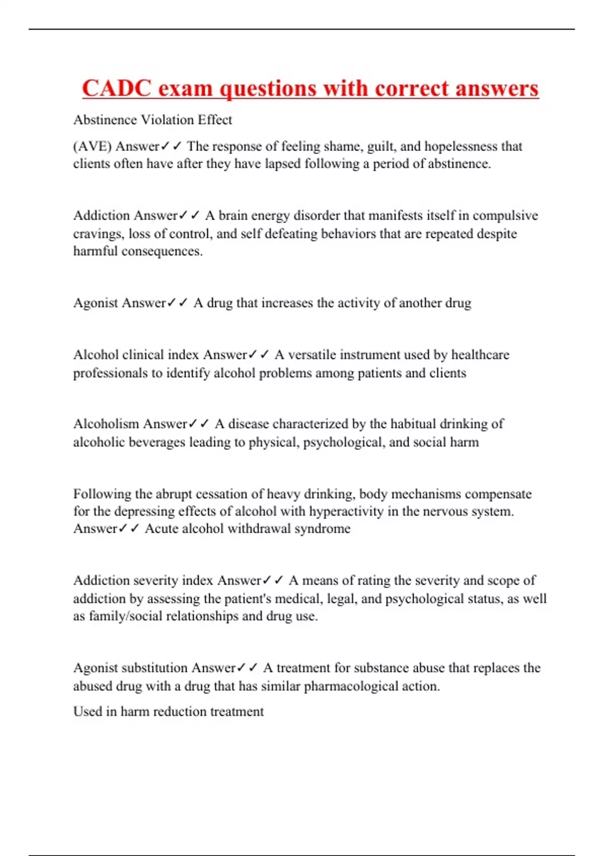Abstinence Violation Effect (AVE) Answer The response of feeling shame, guilt, and hopelessness that clients often have after they have lapsed following a period of abstinence. Addiction Answer A brain energy disorder that manifests itself in compulsive cravings, loss of control, and self defeating behaviors that are repeated despite harmful consequences. Agonist Answer A drug that increases the activity of another drug Alcohol clinical index Answer A versatile instrument used by healthcare professionals to identify alcohol problems among patients and clients Alcoholism Answer A disease characterized by the habitual drinking of alcoholic beverages leading to physical, psychological, and social harm Following the abrupt cessation of heavy drinking, body mechanisms compensate for the depressing effects of alcohol with hyperactivity in the nervous system. Answer Acute alcohol withdrawal syndrome Addiction severity index Answer A means of rating the severity and scope of addiction by assessing the patient's medical, legal, and psychological status, as well as family/social relationships and drug use. Agonist substitution Answer A treatment for substance abuse that replaces the abused drug with a drug that has similar pharmacological action.