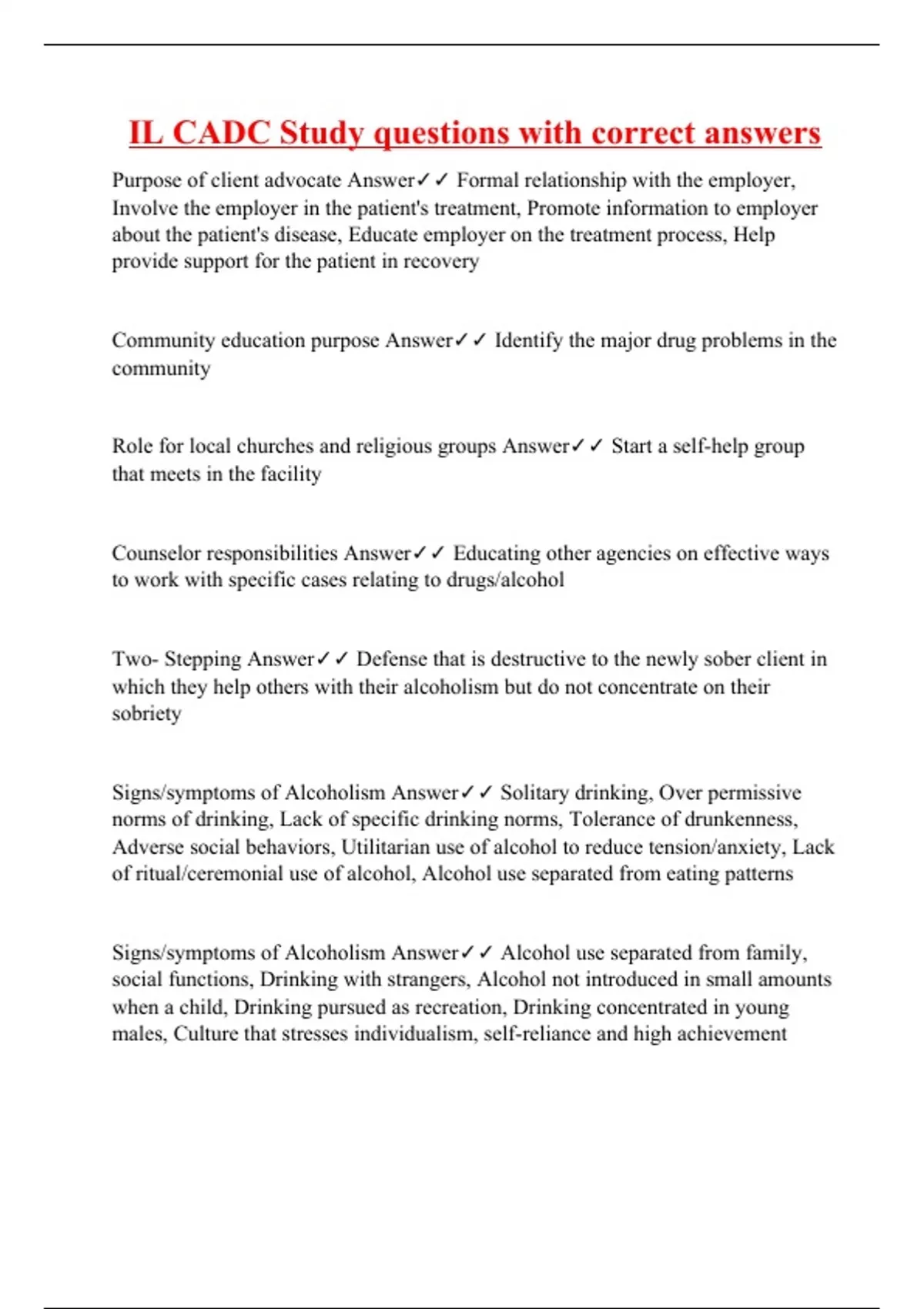 Purpose of client advocate Answer Formal relationship with the employer, Involve the employer in the patient's treatment, Promote information to employer about the patient's disease, Educate employer on the treatment process, Help provide support for the patient in recovery Community education purpose Answer Identify the major drug problems in the community Role for local churches and religious groups Answer Start a self-help group that meets in the facility Counselor responsibilities Answer Educating other agencies on effective ways to work with specific cases relating to drugs/alcohol Two- Stepping Answer Defense that is destructive to the newly sober client in which they help others with their alcoholism but do not concentrate on their sobriety Signs/symptoms of Alcoholism Answer Solitary drinking, Over permissive norms of drinking, Lack of specific drinking norms, Tolerance of drunkenness, Adverse social behaviors, Utilitarian use of alcohol to reduce tension/anxiety, Lack of ritual/ceremonial use of alcohol, Alcohol use separated from eating patterns Signs/symptoms of Alcoholism Answer Alcohol use separated from family, social functions, Drinking with strangers, Alcohol not introduced in small amounts when a child, Drinking pursued as recreation, Drinking concentrated in young males, Culture that stresses individualism, self-reliance and high achievement