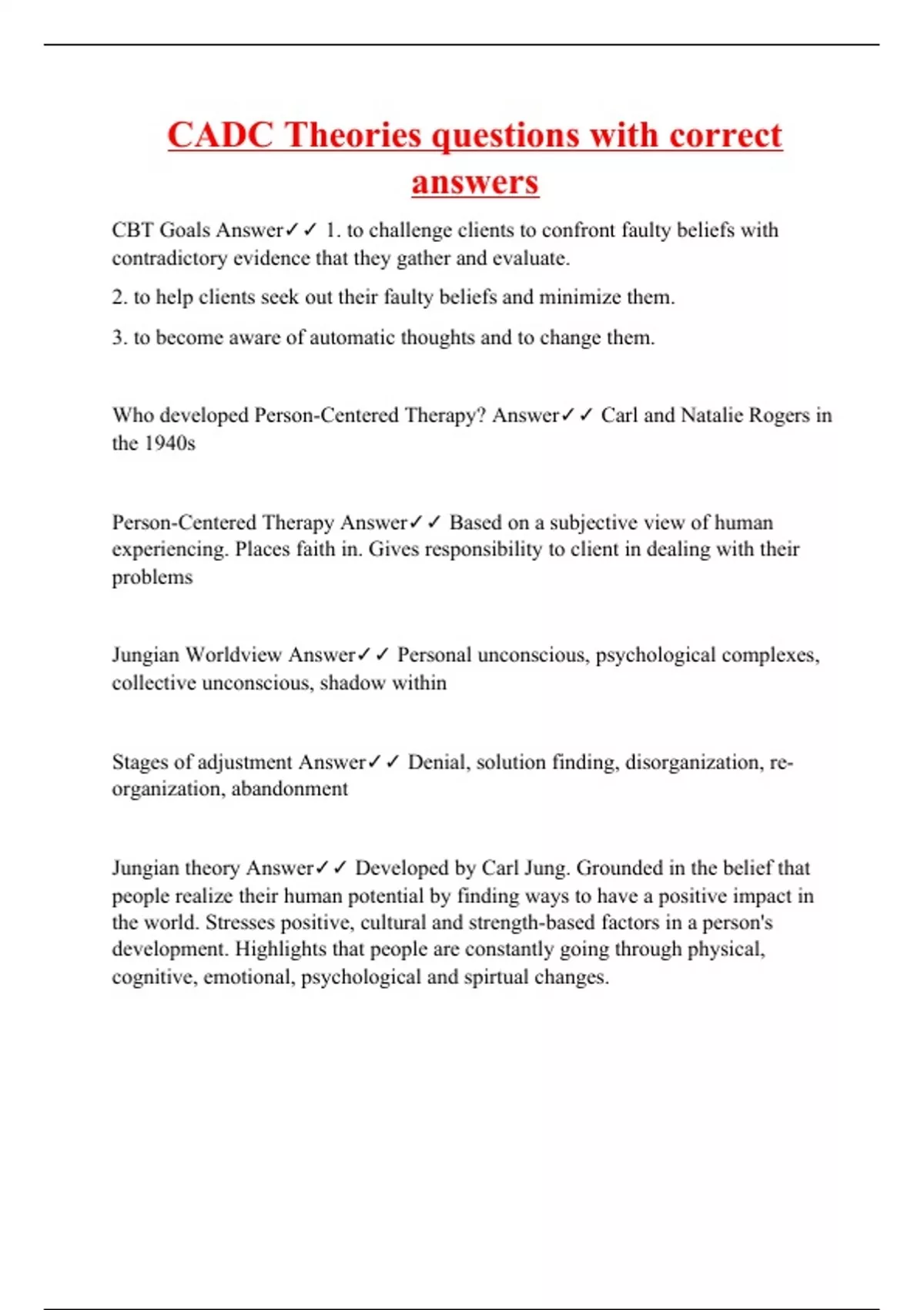 CBT Goals Answer 1. to challenge clients to confront faulty beliefs with contradictory evidence that they gather and evaluate. 2. to help clients seek out their faulty beliefs and minimize them. 3. to become aware of automatic thoughts and to change them. Who developed Person-Centered Therapy? Answer Carl and Natalie Rogers in the 1940s Person-Centered Therapy Answer Based on a subjective view of human experiencing. Places faith in. Gives responsibility to client in dealing with their problems Jungian Worldview Answer Personal unconscious, psychological complexes, collective unconscious, shadow within Stages of adjustment Answer Denial, solution finding, disorganization, re-organization, abandonment Jungian theory Answer Developed by Carl Jung. Grounded in the belief that people realize their human potential by finding ways to have a positive impact in the world. Stresses positive, cultural and strength-based factors in a person's development. Highlights that people are constantly going through physical, cognitive, emotional, psychological and spirtual changes. Virginia Satir Answer Developed the human validation process model. She believed that spontaneity, creativity, humor, self-disclosure, ris