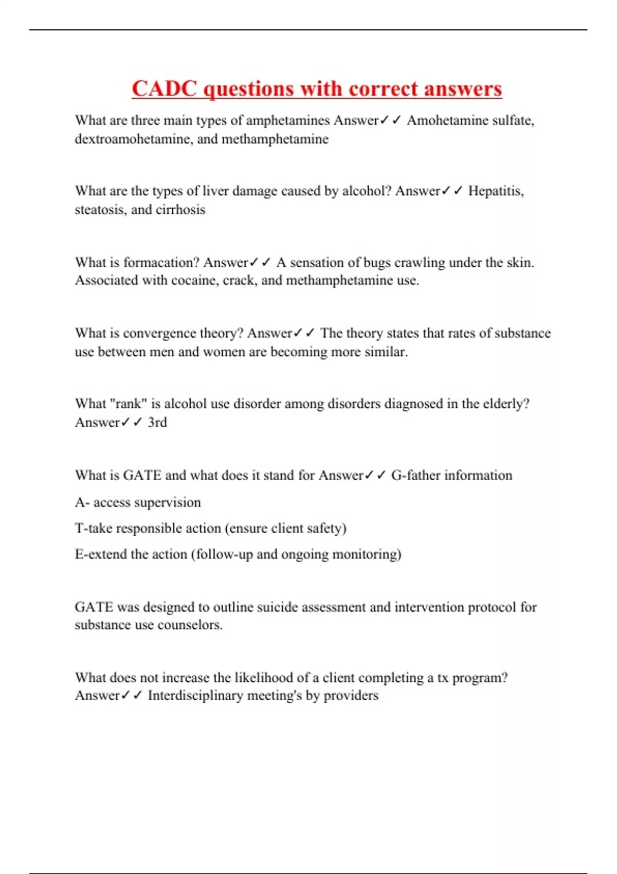 What are three main types of amphetamines Answer Amohetamine sulfate, dextroamohetamine, and methamphetamine What are the types of liver damage caused by alcohol? Answer Hepatitis, steatosis, and cirrhosis What is formacation? Answer A sensation of bugs crawling under the skin. Associated with cocaine, crack, and methamphetamine use. What is convergence theory? Answer The theory states that rates of substance use between men and women are becoming more similar. What "rank" is alcohol use disorder among disorders diagnosed in the elderly? Answer 3rd What is GATE and what does it stand for Answer G-father information A- access supervision T-take responsible action (ensure client safety) E-extend the action (follow-up and ongoing monitoring) GATE was designed to outline suicide assessment and intervention protocol for substance use counselors. What does not increase the likelihood of a client completing a tx program? Answer Interdisciplinary meeting's by providers