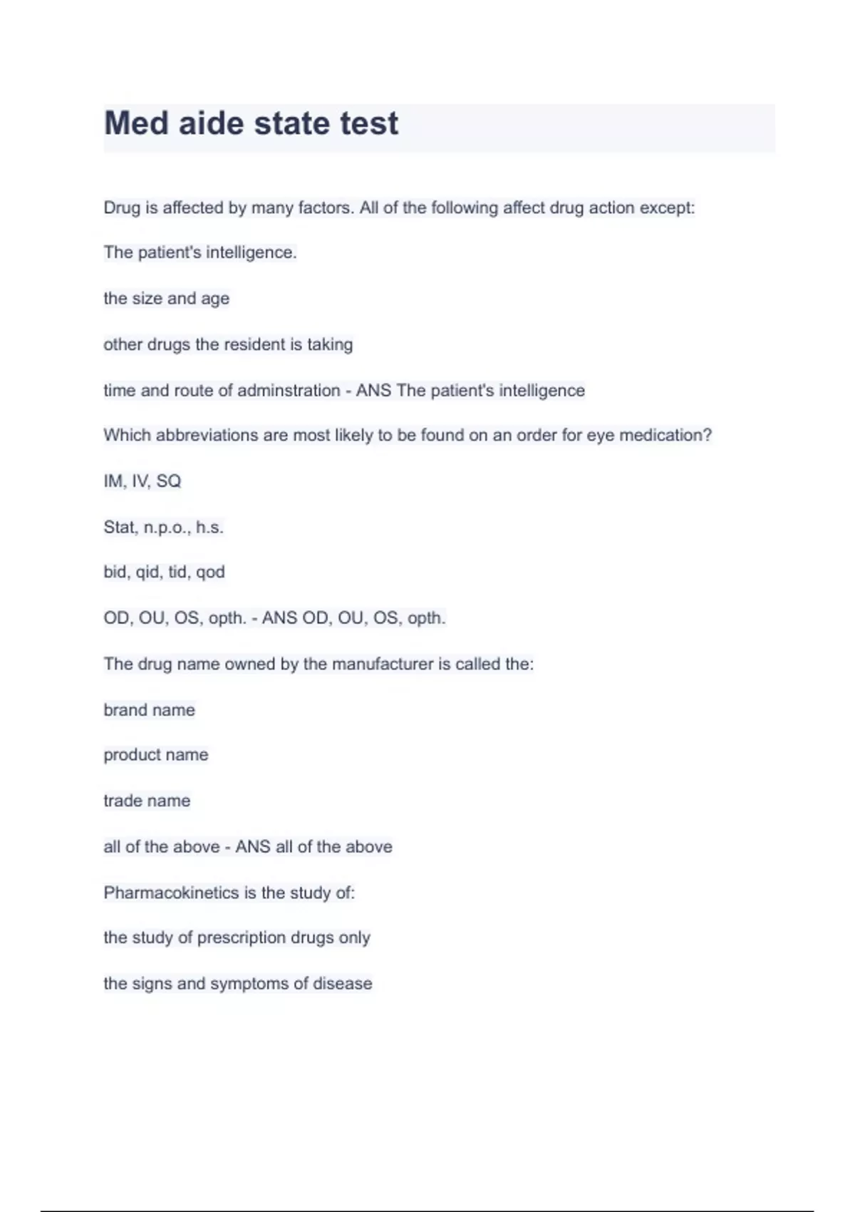 Med aide state test (2022/2023) (Verified Answers) Drug is affected by many factors. All of the following affect drug action except: The patient's intelligence. the size and age other drugs the resident is taking time and route of adminstration - ANS The patient's intelligence Which abbreviations are most likely to be found on an order for eye medication?