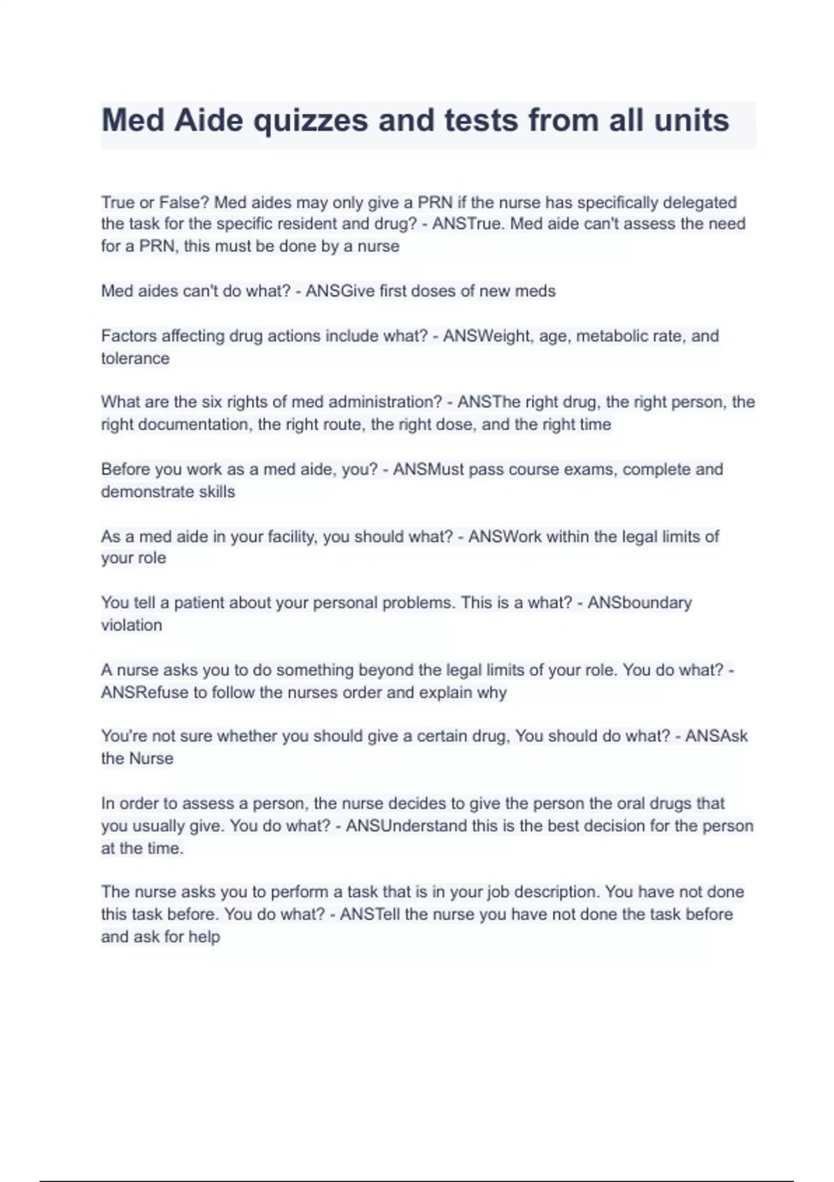 Med Aide quizzes and tests from all units (2022/2023) (Verified Answers) True or False? Med aides may only give a PRN if the nurse has specifically delegated the task for the specific resident and drug? - ANSTrue. Med aide can't assess the need for a PRN, this must be done by a nurse Med aides can't do what? - ANSGive first doses of new meds Factors affecting drug actions include what? - ANSWeight, age, metabolic rate, and tolerance What are the six rights of med administration? - ANSThe right drug, the right person, the right documentation, the right route, the right dose, and the right time