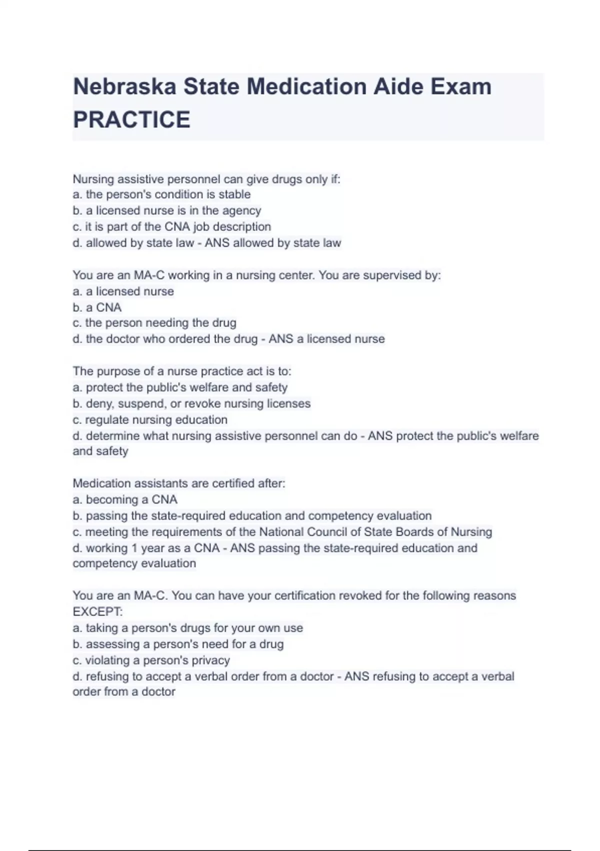 Nebraska State Medication Aide Exam PRACTICE (2022/2023) (Verified Answers)