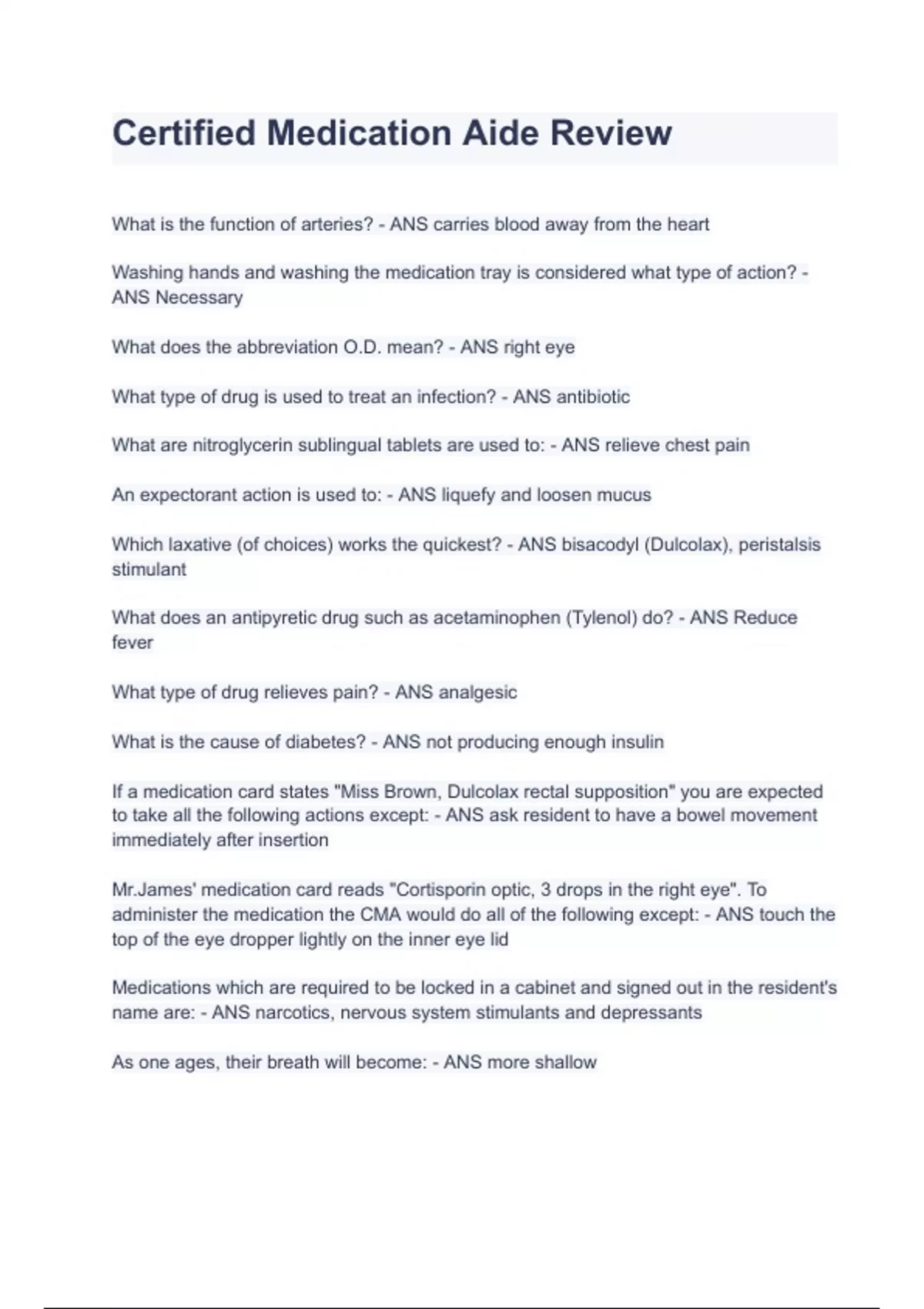 Certified Medication Aide Review (2022/2023) (Verified Answers) What is the function of arteries? - ANS carries blood away from the heart Washing hands and washing the medication tray is considered what type of action? - ANS Necessary What does the abbreviation O.D. mean? - ANS right eye What type of drug is used to treat an infection? - ANS antibiotic