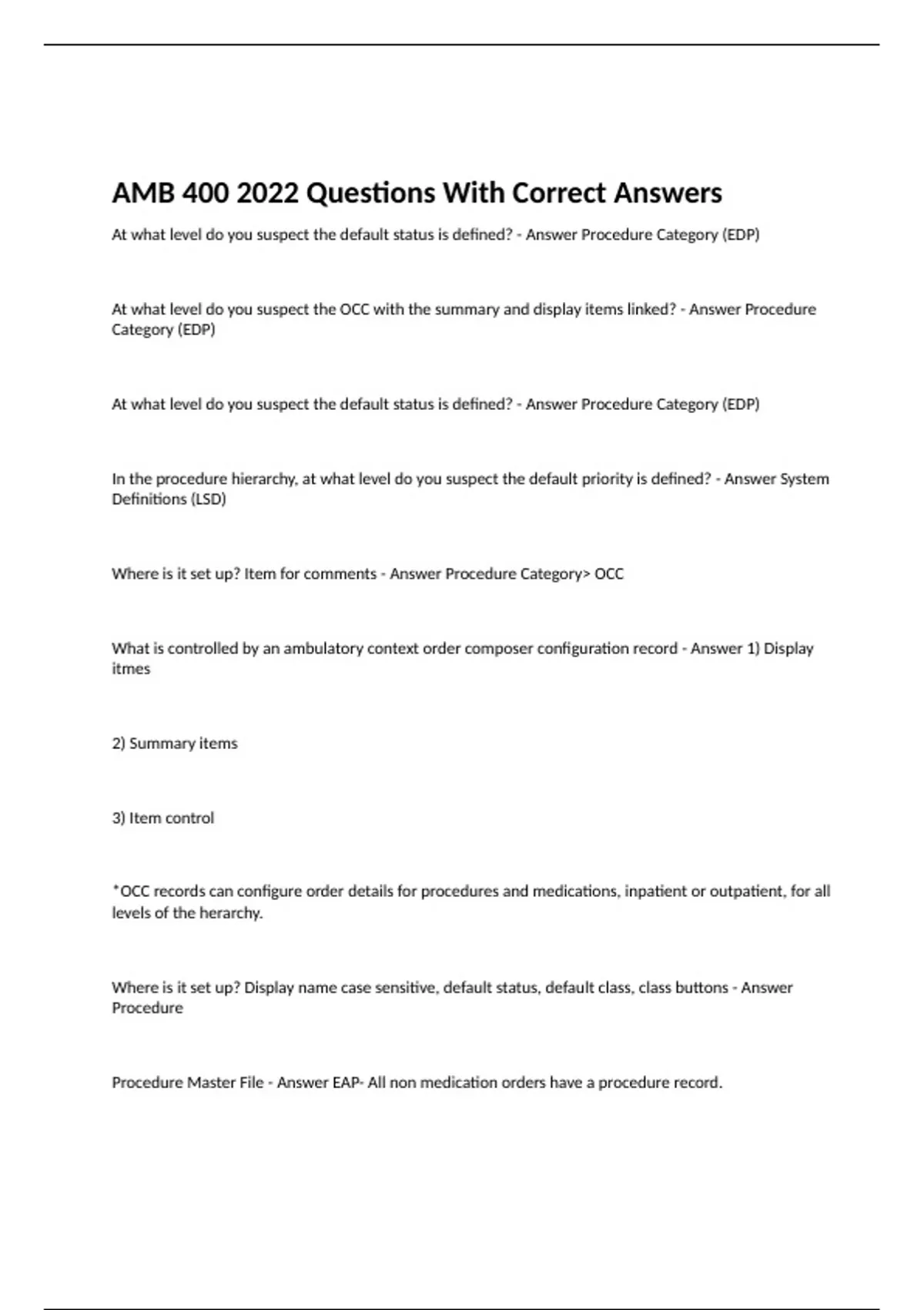 At what level do you suspect the default status is defined? - Answer Procedure Category (EDP) At what level do you suspect the OCC with the summary and display items linked? - Answer Procedure Category (EDP) At what level do you suspect the default status is defined? - Answer Procedure Category (EDP) In the procedure hierarchy, at what level do you suspect the default priority is defined? - Answer System Definitions (LSD) Where is it set up? Item for comments - Answer Procedure Category> OCC What is controlled by an ambulatory context order composer configuration record - Answer 1) Display itmes 2) Summary items 3) Item control *OCC records can configure order details for procedures and medications, inpatient or outpatient, for all levels of the herarchy. Where is it set up? Display name case sensitive, default status, default class, class buttons - Answer Procedure Procedure Master File - Answer EAP- All non medication orders have a procedure record. Procedure Category - Answer EDP- Group procedures that share common settings. Majority of build is done in the procedure category System Definitions - Answer LSD- Acts as "catch-all" Least specific Procedure purposes - Answer Orderable, peforamable, chargeable, historical Orderable - Answer a request that something should be done. Ex: Procedure, service, supply. Should be clinically active and have inactive billing status. Chargeable - Answer Used to bill for a procedure, service, or supply. Example: wrist splint Performable - Answer Represent the actual procedure that was performed. Can be linked to chargeables to help bill correctly. Example: Diabetic foot exam Historical - Answer Only be used to document historical surgical events. On the history navigation section. Example: Appendectomy Dual Record Purpose Combinations - Answer 1. Orderable example: vitals 2. Orderable and performable Example: Colonoscopy 3. Perfromable Example: Diabetic foot exam 4. Performable and Chargeable example: Skin biopsy 5. Chargeable Example: Ankle splint *These are the only possible cominations allowed. Can never be orderable and chargeable. Which of the following can be specified in system definitions or in an OCC linked to system definitions? - Answer Display items Default Priority Item Buttons An ankle x-ray procedure is linked to the procedure category x-ray orderables. All other procedures linked to this category have three class buttons, while this procedure has four. All orders within the category have the same allowed classes, so what is the difference? - Answer 1) There are 3 class buttons defined in the procedure category. 2) There are 4 class buttons defined in the procedure record. Patient needs an immunization. 1) Document the administration in? 2) System looks at what record? - Answer 1) Immunization Activity 2) Immunization ( LIM) Patient needs an immunization 1) Order it in? 2) System looks at what record? - Answer 1) Meds and Orders 2) Procedure ( EAP) Patient explains he got a shot elsewhere. 1) Document this in? 2) System looks at what record? - Answer 1) Immunization Activity 2) Immunization ( LIM) Immunization question ( LQL) - Answer Built in text After ordering a varicella vaccination procedure, a clinician will open the immunizations activity to administer the immunization and default dose of 0.5 mL appears. When a clinician is documenting a patient reported varicella vaccination using the same varicella immunization record, what will appear for the dose? - Answer blank field. (this is a historical immunization) Your providers would like the question "is the patient pregnant?" to appear when ordering an x-ray for femail patients aged 12 or older. After the order-specific question has been created how will you accomplish this request? - Answer Link the question to the x-ray oderables procedure category True or False. Importing can be used to edit multiple records quickly - Answer True Importing - Answer done in user master file ( EMP) Chronicles > Export data to create spreadsheet > Spread sheet .XML > Populate the spreadsheet with information you want in the system then convert to flat file > Flat file (.TXT) > scan the document and fix errors > Import to Chronicles Terms in Spreadsheet for export - Answer A row represents a record. A column represent an Item. The intersection for a row and a column is a value. Preference List Editor (EPD) - Answer for visit diagnosis or LOS codes, no overrides are necessary and a simple list works well. Does not allow you to override details of the records. Preference List Composer (LPF) - Answer Collects orderable records (medications and procedures) and allows overrides to their default values. System Preference Lists - Answer lists intended for use by groups of users in your facility. Can be specified at any level of the profile hierarchy. Administrative settings determine what types of preference lists are enabled, how they appear, an dhow they can be used. User Preference Lists - Answer Specific to an individual clinician. A clinician specifies orders that are commonly used. Frequent Orders Preference Lists. - Answer Created by system based on computational learning but their maintenance is the responsibility of the project team. True or False. An administrator adds a hematocrit lab to an existing preference list. When adding the lab, the administrator intentionally leaves all of the items with in the order composer blank. This ensures that when a user orders the hematocrit lab from this preference list the default values will be overridden with blank fields. - Answer False True or False. In a procedure preference list, you must create at lease one section to be able to add an item. - Answer True Where can user preference lists be restricted? - Answer 1) In the user settings from a user record 2) In the User Preference list settings of an EpicCare Security Class record. 3) In System Definitions. True or False. Preference list created in the Preference List Editor cannot override a records detail