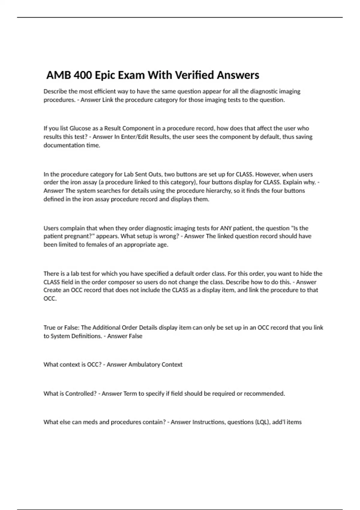 Describe the most efficient way to have the same question appear for all the diagnostic imaging procedures. - Answer Link the procedure category for those imaging tests to the question. If you list Glucose as a Result Component in a procedure record, how does that affect the user who results this test? - Answer In Enter/Edit Results, the user sees the component by default, thus saving documentation time. In the procedure category for Lab Sent Outs, two buttons are set up for CLASS. However, when users order the iron assay (a procedure linked to this category), four buttons display for CLASS. Explain why. - Answer The system searches for details using the procedure hierarchy, so it finds the four buttons defined in the iron assay procedure record and displays them. Users complain that when they order diagnostic imaging tests for ANY patient, the question "Is the patient pregnant?" appears. What setup is wrong? - Answer The linked question record should have been limited to females of an appropriate age. There is a lab test for which you have specified a default order class. For this order, you want to hide the CLASS field in the order composer so users do not change the class. Describe how to do this. - Answer Create an OCC record that does not include the CLASS as a display item, and link the procedure to that OCC. True or False: The Additional Order Details display item can only be set up in an OCC record that you link to System Definitions. - Answer False What context is OCC? - Answer Ambulatory Context What is Controlled? - Answer Term to specify if field should be required or recommended. What else can meds and procedures contain? - Answer Instructions, questions (LQL), add'l items What is EAP? - Answer Procedures Orderable procedures must be linked to what in order for them to be looked up in order entry? - Answer Procedure Category What is determined in the procedure/ procedure category? - Answer Buttons, default order status, default order class, what should be available. Where are the buttons entered in a procedure/procedure category? - Answer Outpatient order composer buttons selection screen What and where determines what order classes are available? - Answer Procedure/procedure category and under 'Allowed Order Class Section' What procedure name is seen by end users? - Answer Order Display Name Where can free text fields be added to orders? - Answer OCC LQL Questions- what should be entered for free text? - Answer Response type: Text If questions are linked to a procedure and its category, what happens? - Answer Both sets of questions appear (even one question more than once) from both levels If questions should only not be displayed from both the procedure and the procedure category, what can be done? - Answer This can be overridden so that only procedure-level questions display. What are primary display items? - Answer OCC Procedure details What are secondary display items? - Answer Show Add'l details Order class buttons and the default order class are chosen from what section? - Answer "Allowed order classes" True or False: If a value has not been listed as allowed, this cannot be listed as a button or default value? - Answer True Procedure Category Setup for OCC - Answer Ambulatory context -> Your AMB POCT Orderables OCC Additional Outpatient Order Details Context -> AMB Point of Care Additional Order Details Procedures Link to a Result Component are listed as what? - Answer Orderable and Performable Procedures Link to a Result Component are linked where? - Answer Lab and Result Entry Information Screen Procedures Link to a Result Component and a type is specified where? - Answer Default Specimen Type (Ex. =Blood) Procedures Link to a Result Component and the sources available are located where? - Answer Procedure Specific Specimen Sources Screen (Ex Arm, Left (43); Arm, Right (44) ) True or False: Referral display items can change based on the selected order class. - Answer True What is the context of the OCC that includes the "pointer" referral display item? - Answer Ambulatory A physician requests that dynamic display items be set up for a medication based on the frequency (4 times daily versus 2 times daily). Will you be able to do this? - Answer No. Dynamic setup is only for referral procedures. OCC-Referrals are linked where - Answer Procedure category under the order composer configeration screen What for referrals can change display items? - Answer Class How many OCCs are needed for referral procedures? - Answer 3 What are the 3 contexts needed for dynamic referral procedures? - Answer -Ambulatory context; Internal referral- ambulatory context; -external-referral -ambulatory context; (can also use 4th of incoming referral when organization receives faxed referrals from external providers) What contexts are needed for non-dynamic referral procedures? - Answer ambulatory context; referral-ambulatory What is Referral information for OCC? - Answer Display item for OCC record; tells system to check the linked referral context OCC to determine which referral-based item to display What is needed for an Internal referral-ambulatory OCC? - Answer Ordering type: Procedure; Ordering Context: Internal Referral-Ambulatory; Display Items What is needed for an External referral-ambulatory OCC? - Answer Ordering type: Procedure; Ordering Context: External Referral-Ambulatory; Display Items True or False: In order to document a historical immunization, you must have a procedure record. - Answer False True or False: Questions can be linked to a procedure or an immunization. - Answer True What is the abbreviation for immunizations on the immunizations activity? - Answer LIM Where are order-specific questions linked? - Answer in the Procedure record; Questions are LQL Where are the immunization activity-specific questions linked? - Answer in the Immunization record; Questions are LQL What field in the procedure record is the immunization activity record linked? - Answer "Link to immun