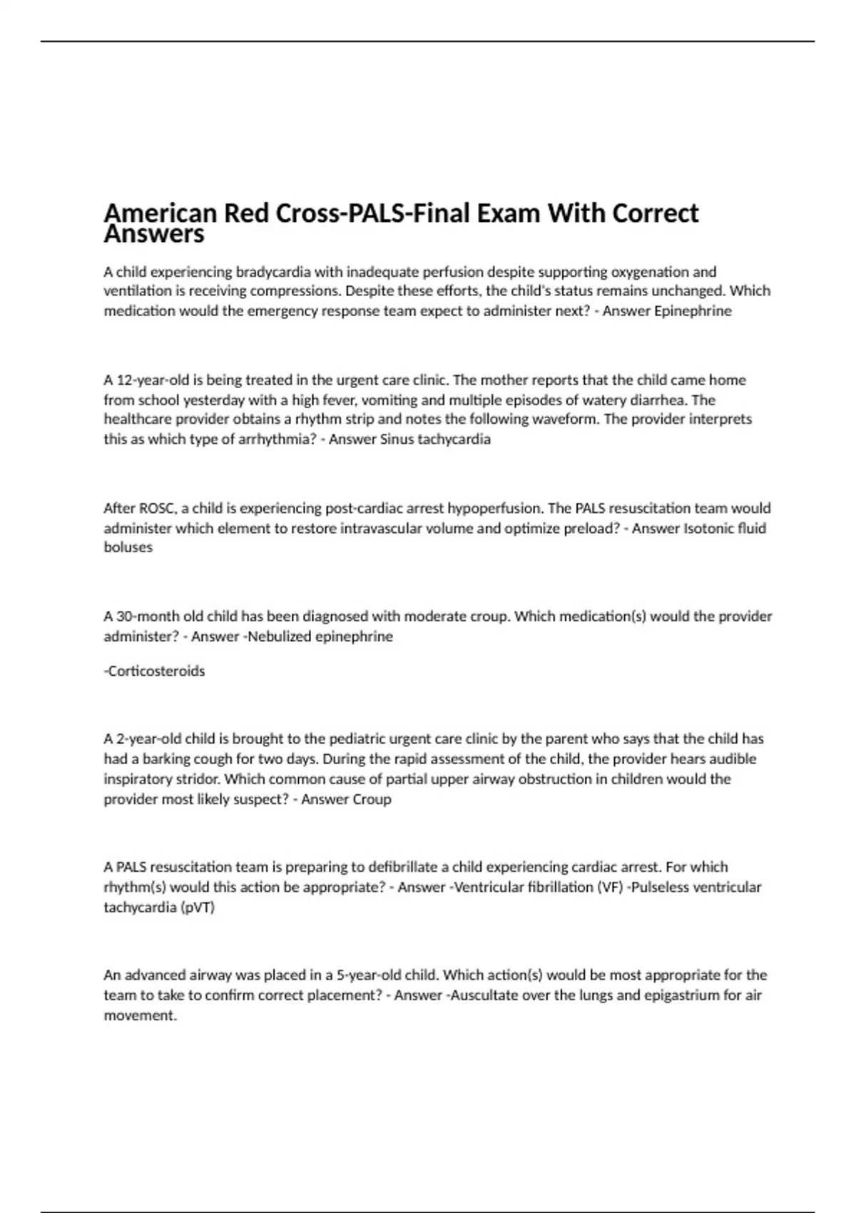 A child experiencing bradycardia with inadequate perfusion despite supporting oxygenation and ventilation is receiving compressions. Despite these efforts, the child's status remains unchanged. Which medication would the emergency response team expect to administer next? - Answer Epinephrine A 12-year-old is being treated in the urgent care clinic. The mother reports that the child came home from school yesterday with a high fever, vomiting and multiple episodes of watery diarrhea. The healthcare provider obtains a rhythm strip and notes the following waveform. The provider interprets this as which type of arrhythmia? - Answer Sinus tachycardia After ROSC, a child is experiencing post-cardiac arrest hypoperfusion. The PALS resuscitation team would administer which element to restore intravascular volume and optimize preload? - Answer Isotonic fluid boluses A 30-month old child has been diagnosed with moderate croup. Which medication(s) would the provider administer? - Answer -Nebulized epinephrine -Corticosteroids A 2-year-old child is brought to the pediatric urgent care clinic by the parent who says that the child has had a barking cough for two days. During the rapid assessment of the child, the provider hears audible inspiratory stridor. Which common cause of partial upper airway obstruction in children would the provider most likely suspect? - Answer Croup A PALS resuscitation team is preparing to defibrillate a child experiencing cardiac arrest. For which rhythm(s) would this action be appropriate? - Answer -Ventricular fibrillation (VF) -Pulseless ventricular tachycardia (pVT) An advanced airway was placed in a 5-year-old child. Which action(s) would be most appropriate for the team to take to confirm correct placement? - Answer -Auscultate over the lungs and epigastrium for air movement. -Observe for bilateral chest rise. -Evaluate results of capnography. What is considered inadequate perfusion when assessing/caring for a pediatric patient with an arrhythmia? - Answer -Acutely altered mental status -Diminished peripheral pulses -Hypotension A 2-year-old child arrives at the emergency department with the parents. The child is unresponsive, is not breathing and has no pulse. Two emergency department providers begin high-quality CPR. Which action(s) by the providers demonstrates high-quality CPR? - Answer -Providing ventilations that last about 1 second each -Compressing the chest about 2 inches -Giving 2 ventilations to every 15 compressions -Allowing the chest to recoil fully after each compression A provider is caring for a 4-year-old child in the urgent care clinic. Primary assessment reveals difficulty breathing and an oxygen saturation of 91%. The provider administers oxygen by nasal cannula with the goal of improving the child's oxygen saturation to what percentage range? - Answer 94% to 99% A 7-year-old child collapses on the playground at school. The school nurse is called to the scene and determines that the child is unresponsive and is not breathing and has no pulse. The nurse initiates CPR. At what rate and depth would the nurse deliver compressions to this child? - Answer 100 to 120 compressions per minute at a depth of about 2 inches A 4-year-old child suddenly collapses in the playroom of the facility. A healthcare provider observes the event and hurries over to assess the child. The healthcare provider completes which assessment first? - Answer Rapid assessment The PALS team leader is conducting a debriefing session with the team. Which topic(s) would the team leader most likely address during the session? - Answer -Evaluation of the objective data gathered during the event -Discussion of the pros and cons of the interventions -Summary of the event, including what actions were taken -Identification of ways to improve A 10-year-old child has collapsed in the gym of the elementary school. The school nurse arrives and determines that the child is unresponsive. The school nurse then simultaneously checks for breathing and a central pulse, limiting this assessment to which time frame? - Answer No more than 10 seconds A healthcare provider notices petechiae on the arms and legs while performing a rapid skin assessment of a child with a high fever and respiratory distress. Based on this assessment, which condition should the provider consider? - Answer Life-threatening systemic infection A provider is forming an initial impression of a child using the Pediatric Assessment Triangle (PAT). For which part of the PAT may the provider use the mnemonic TICLS to assess the patient? - Answer Appearance