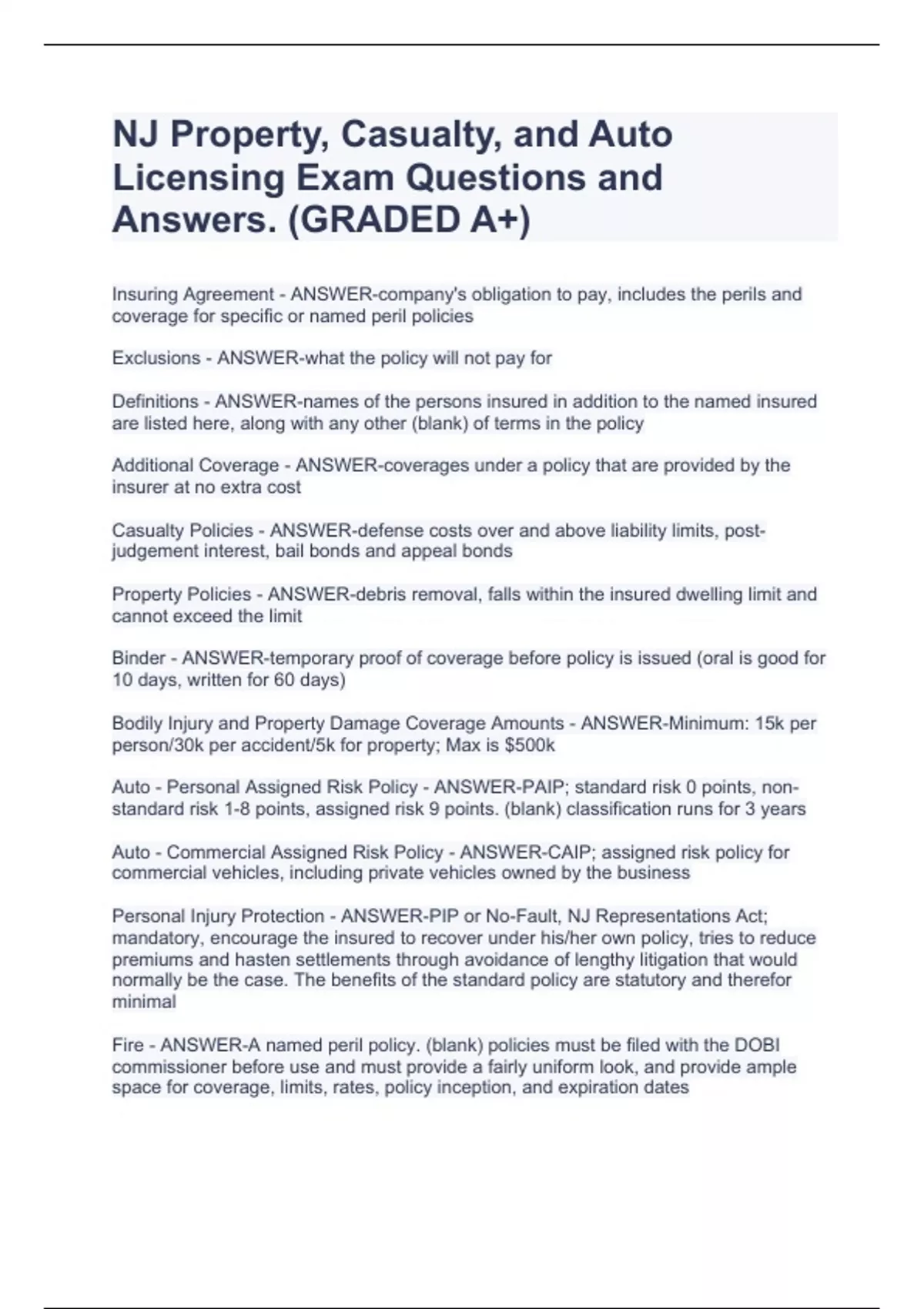NJ Property, Casualty, and Auto Licensing Exam Questions and Answers. (GRADED A+)
