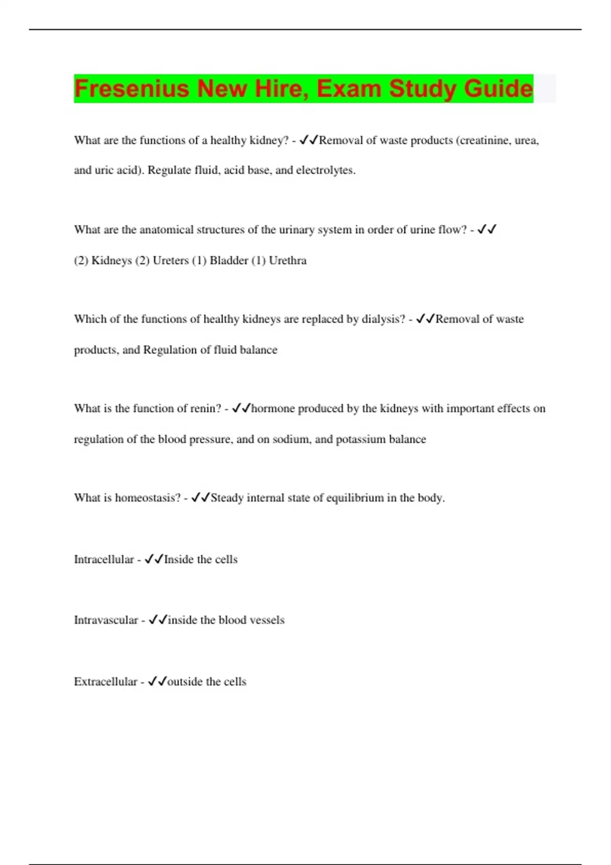 What are the functions of a healthy kidney? - Removal of waste products (creatinine, urea, and uric acid). Regulate fluid, acid base, and electrolytes. What are the anatomical structures of the urinary system in order of urine flow? - (2) Kidneys (2) Ureters (1) Bladder (1) Urethra Which of the functions of healthy kidneys are replaced by dialysis? - Removal of waste products, and Regulation of fluid balance What is the function of renin? - hormone produced by the kidneys with important effects on regulation of the blood pressure, and on sodium, and potassium balance What is homeostasis? - Steady internal state of equilibrium in the body. Intracellular - Inside the cells Intravascular - inside the blood vessels Extracellular - outside the cells