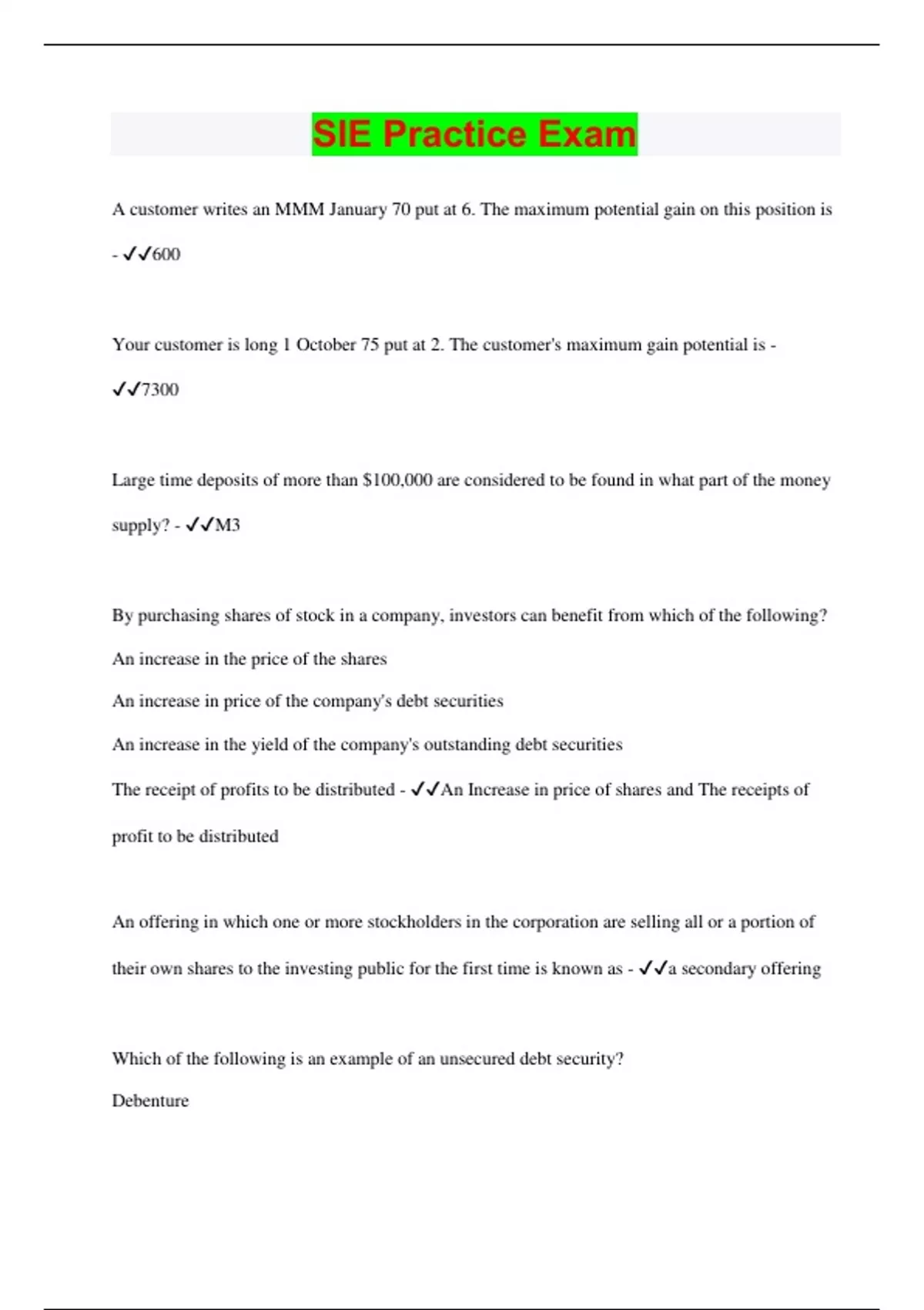 A customer writes an MMM January 70 put at 6. The maximum potential gain on this position is - 600 Your customer is long 1 October 75 put at 2. The customer's maximum gain potential is - 7300 Large time deposits of more than $100,000 are considered to be found in what part of the money supply? - M3 By purchasing shares of stock in a company, investors can benefit from which of the following? An increase in the price of the shares An increase in price of the company's debt securities An increase in the yield of the company's outstanding debt securities The receipt of profits to be distributed - An Increase in price of shares and The receipts of profit to be distributed An offering in which one or more stockholders in the corporation are selling all or a portion of their own shares to the investing public for the first time is known as - a secondary offering Which of the following is an example of an unsecured debt security? Debenture