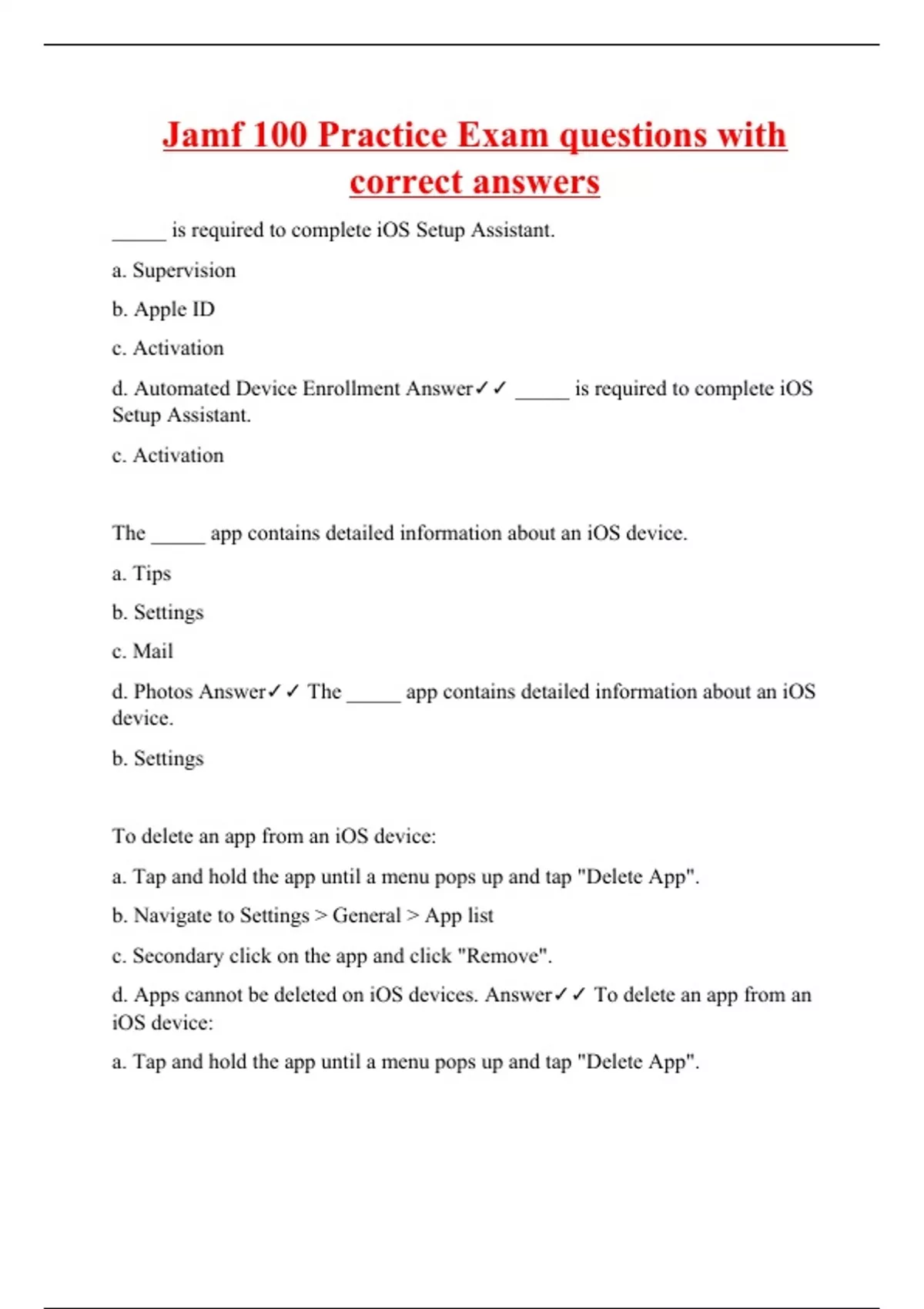 _____ is required to complete iOS Setup Assistant. a. Supervision b. Apple ID c. Activation d. Automated Device Enrollment Answer _____ is required to complete iOS Setup Assistant. c. Activation The _____ app contains detailed information about an iOS device. a. Tips b. Settings c. Mail d. Photos Answer The _____ app contains detailed information about an iOS device. b. Settings To delete an app from an iOS device: a. Tap and hold the app until a menu pops up and tap "Delete App". b. Navigate to Settings > General > App list c. Secondary click on the app and click "Remove". d. Apps cannot be deleted on iOS devices. Answer To delete an app from an iOS device: a. Tap and hold the app until a menu pops up and tap "Delete App".