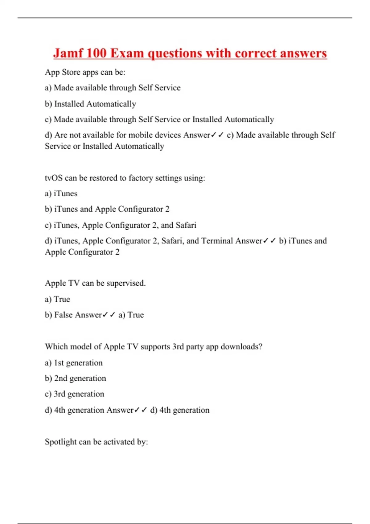 App Store apps can be: a) Made available through Self Service b) Installed Automatically c) Made available through Self Service or Installed Automatically d) Are not available for mobile devices Answer c) Made available through Self Service or Installed Automatically tvOS can be restored to factory settings using: a) iTunes b) iTunes and Apple Configurator 2 c) iTunes, Apple Configurator 2, and Safari d) iTunes, Apple Configurator 2, Safari, and Terminal Answer b) iTunes and Apple Configurator 2 Apple TV can be supervised. a) True b) False Answer a) True Which model of Apple TV supports 3rd party app downloads? a) 1st generation b) 2nd generation c) 3rd generation d) 4th generation Answer d) 4th generation Spotlight can be activated by: