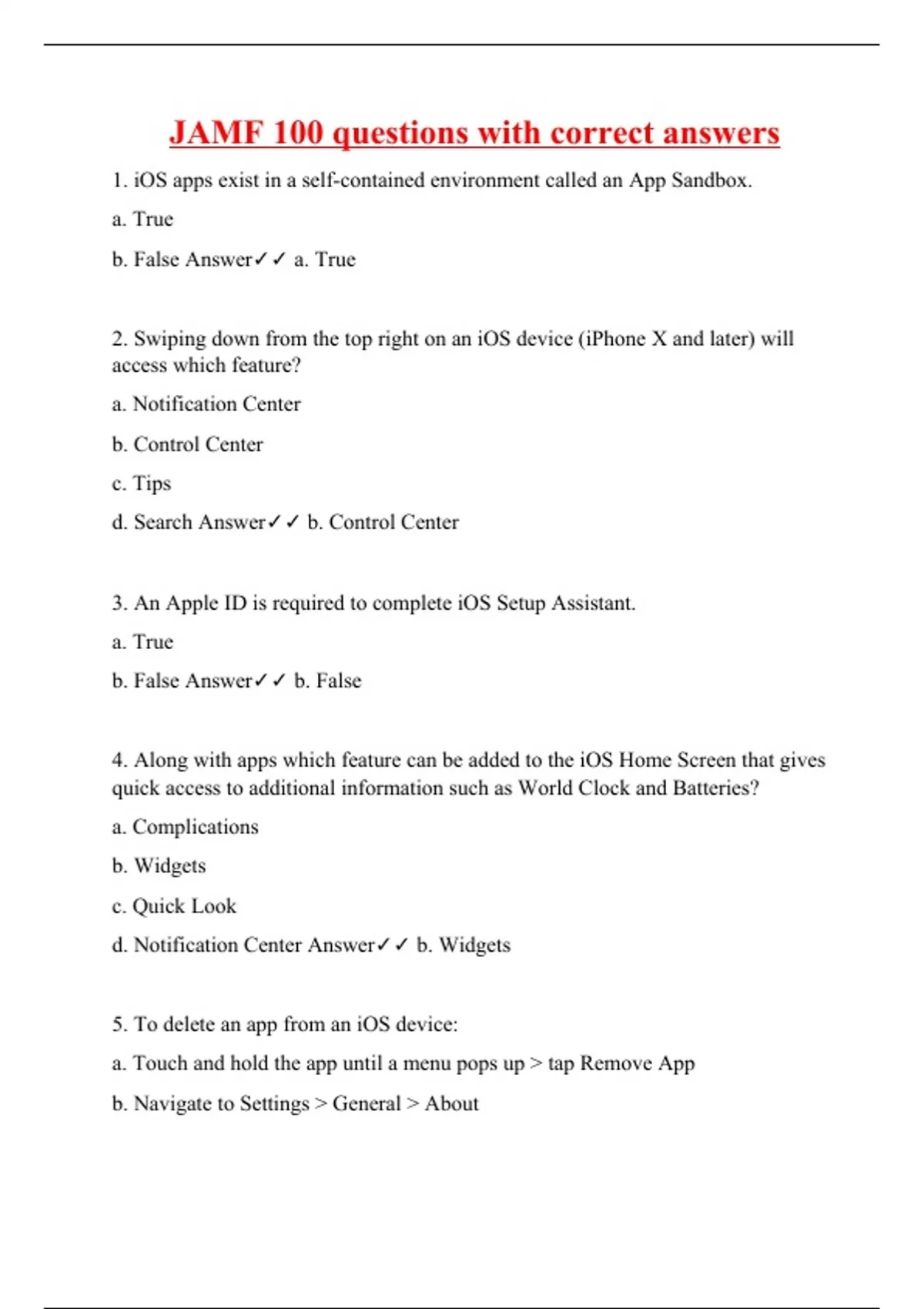 1. iOS apps exist in a self-contained environment called an App Sandbox. a. True b. False Answer a. True 2. Swiping down from the top right on an iOS device (iPhone X and later) will access which feature? a. Notification Center b. Control Center c. Tips d. Search Answer b. Control Center 3. An Apple ID is required to complete iOS Setup Assistant. a. True b. False Answer b. False 4. Along with apps which feature can be added to the iOS Home Screen that gives quick access to additional information such as World Clock and Batteries? a. Complications b. Widgets c. Quick Look d. Notification Center Answer b. Widgets 5. To delete an app from an iOS device: a. Touch and hold the app until a menu pops up > tap Remov