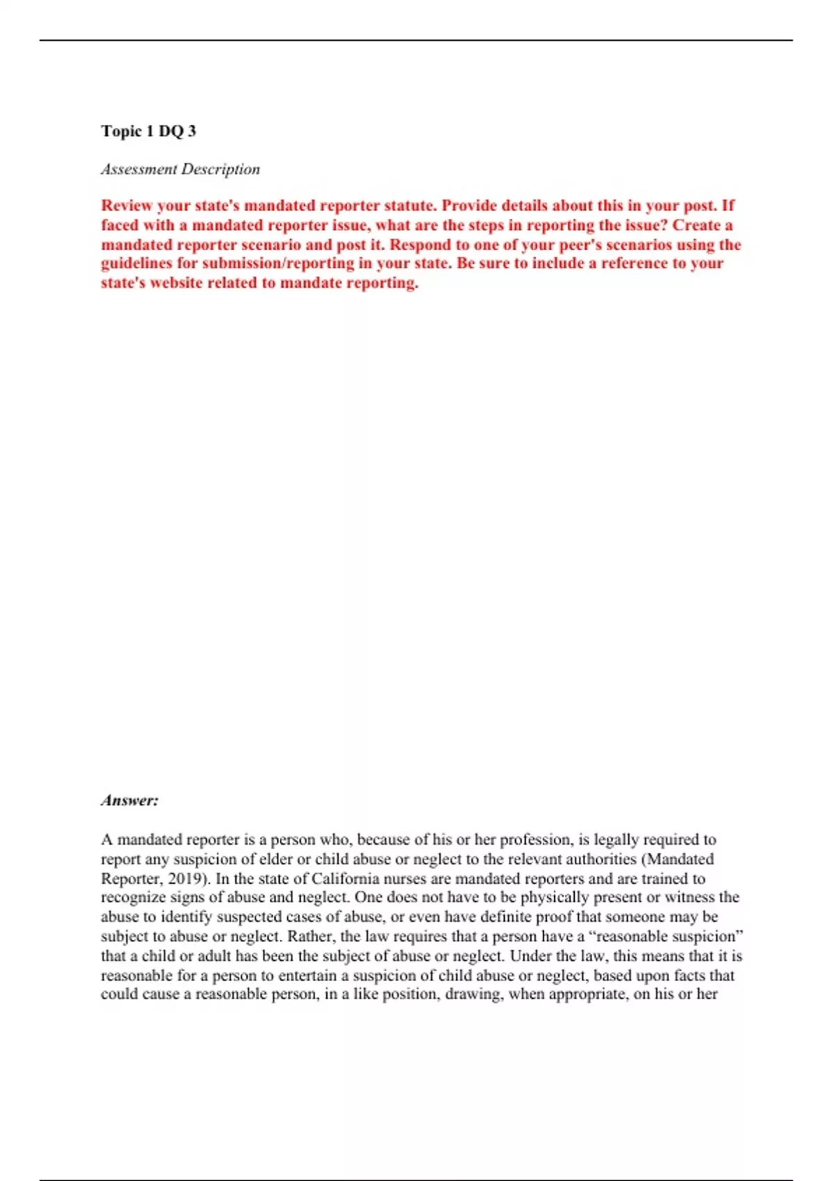 Topic 1 DQ3 Assessment Description Review your state's mandated reporter statute. Provide details about this in your post. If faced with a mandated reporter issue, what are the steps in reporting the issue? Create a mandated reporter scenario and post it. Respond to one of your peer's scenarios using the guidelines for submission/reporting in your state. Be sure to include a reference to your state's website related to mandate reporting.