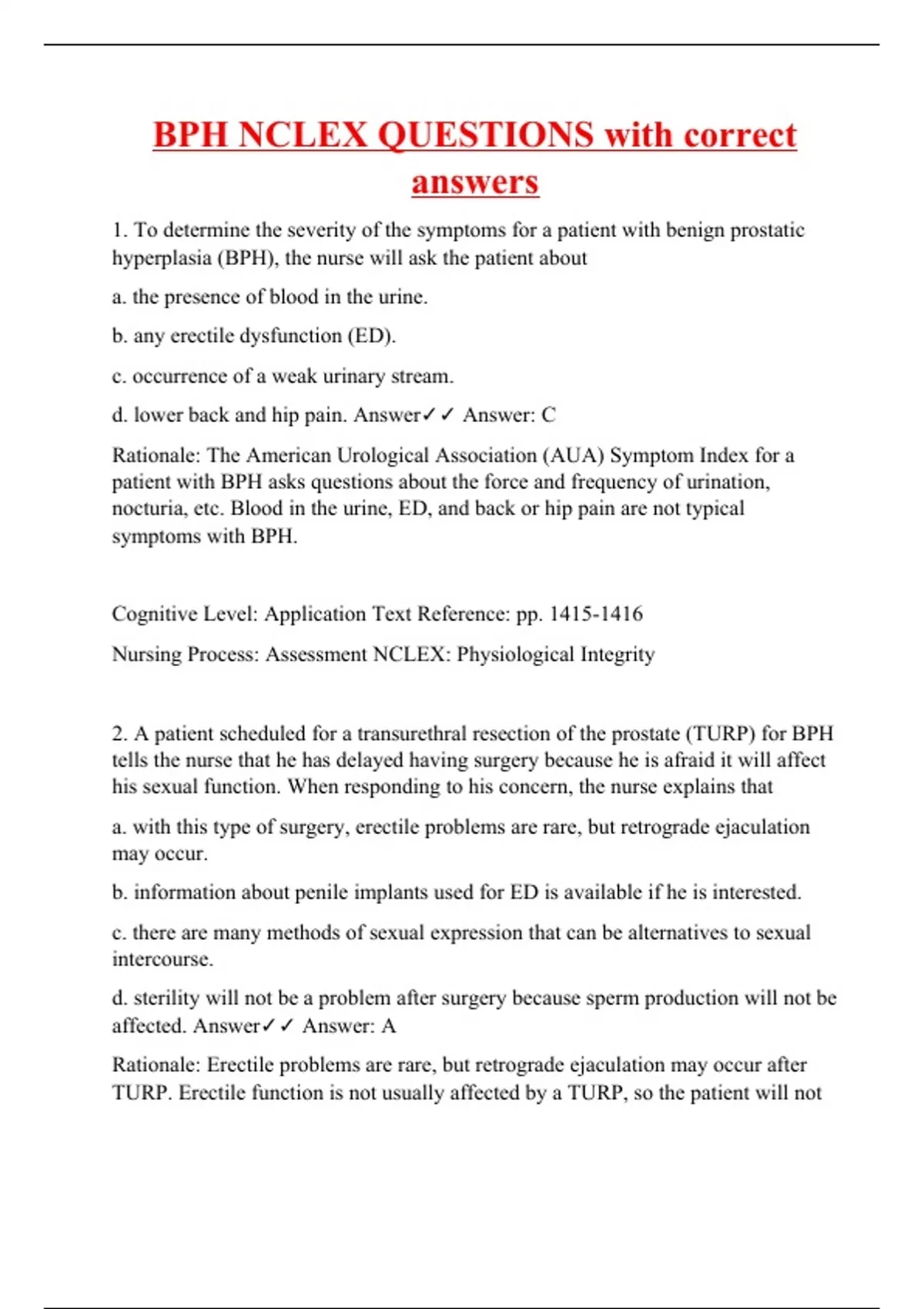 1. To determine the severity of the symptoms for a patient with benign prostatic hyperplasia (BPH), the nurse will ask the patient about a. the presence of blood in the urine. b. any erectile dysfunction (ED). c. occurrence of a weak urinary stream. d. lower back and hip pain. Answer Answer: C Rationale: The American Urological Association (AUA) Symptom Index for a patient with BPH asks questions about the force and frequency of urination, nocturia, etc. Blood in the urine, ED, and back or hip pain are not typical symptoms with BPH. Cognitive Level: Application Text Reference: pp. Nursing Process: Assessment NCLEX: Physiological Integrity 2. A patient scheduled for a transurethral resection of the prostate (TURP) for BPH tells the nurse that he has delayed having surgery because he is afraid it will affect his sexual function. When responding to his concern, the nurse explains that a. with this type of surgery, erectile problems are rare, but retrograde ejaculation may occur. b. information about penile implants used for ED is available if he is interested. c. there are many methods of sexual expression that can be alternatives to sexual intercourse. d. sterility will not be a problem after surgery because sperm production will not be affected. Answer Answer: A