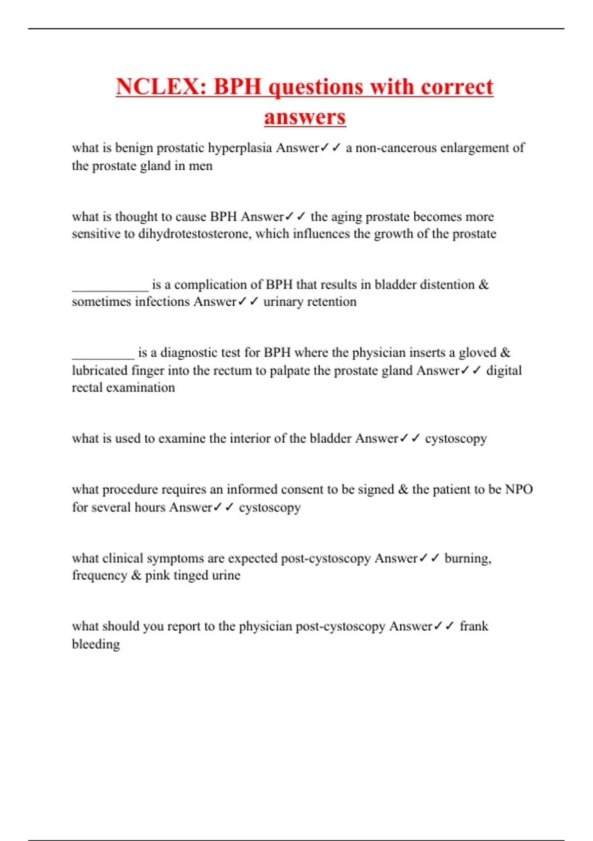 what is benign prostatic hyperplasia Answer a non-cancerous enlargement of the prostate gland in men what is thought to cause BPH Answer the aging prostate becomes more sensitive to dihydrotestosterone, which influences the growth of the prostate ___________ is a complication of BPH that results in bladder distention & sometimes infections Answer urinary retention _________ is a diagnostic test for BPH where the physician inserts a gloved & lubricated finger into the rectum to palpate the prostate gland Answer digital rectal examination what is used to examine the interior of the bladder Answer cystoscopy what procedure requires an informed consent to be signed & the patient to be NPO for several hours Answer cystoscopy what clinical symptoms are expected post-cystoscopy Answer burning, frequency & pink tinged urine what should you report to the physician post-cystoscopy Answer frank bleeding