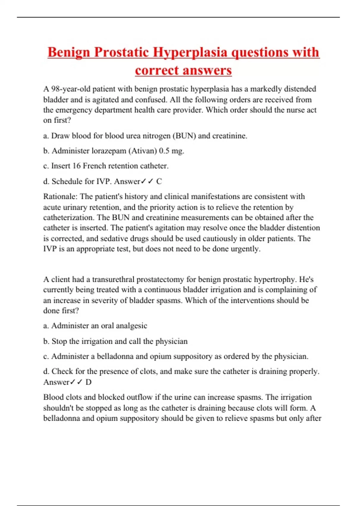 A 98-year-old patient with benign prostatic hyperplasia has a markedly distended bladder and is agitated and confused. All the following orders are received from the emergency department health care provider. Which order should the nurse act on first? a. Draw blood for blood urea nitrogen (BUN) and creatinine. b. Administer lorazepam (Ativan) 0.5 mg. c. Insert 16 French retention catheter. d. Schedule for IVP. Answer C Rationale: The patient's history and clinical manifestations are consistent with acute urinary retention, and the priority action is to relieve the retention by catheterization. The BUN and creatinine measurements can be obtained after the catheter is inserted. The patient's agitation may resolve once the bladder distention is corrected, and sedative drugs should be used cautiously in older patients. The IVP is an appropriate test, but does not need to be done urgently. A client had a transurethral prostatectomy for benign prostatic hypertrophy. He's currently being treated with a continuous bladder irrigation and is complaining of an increase in severity of bladder spasms. Which of the interventions should be done first? a. Administer an oral analgesic b. Stop the irrigation and call the physician c. Administer a belladonna and opium suppository as ordered by the physician. d. Check for the presence of clots, and make sure the catheter is draining properly. Answer D Blood clots and blocked outflow if the urine can increase spasms. The irrigation shouldn't be stopped as long as the catheter is draining because clots will form. A belladonna and opium suppository should be given to relieve