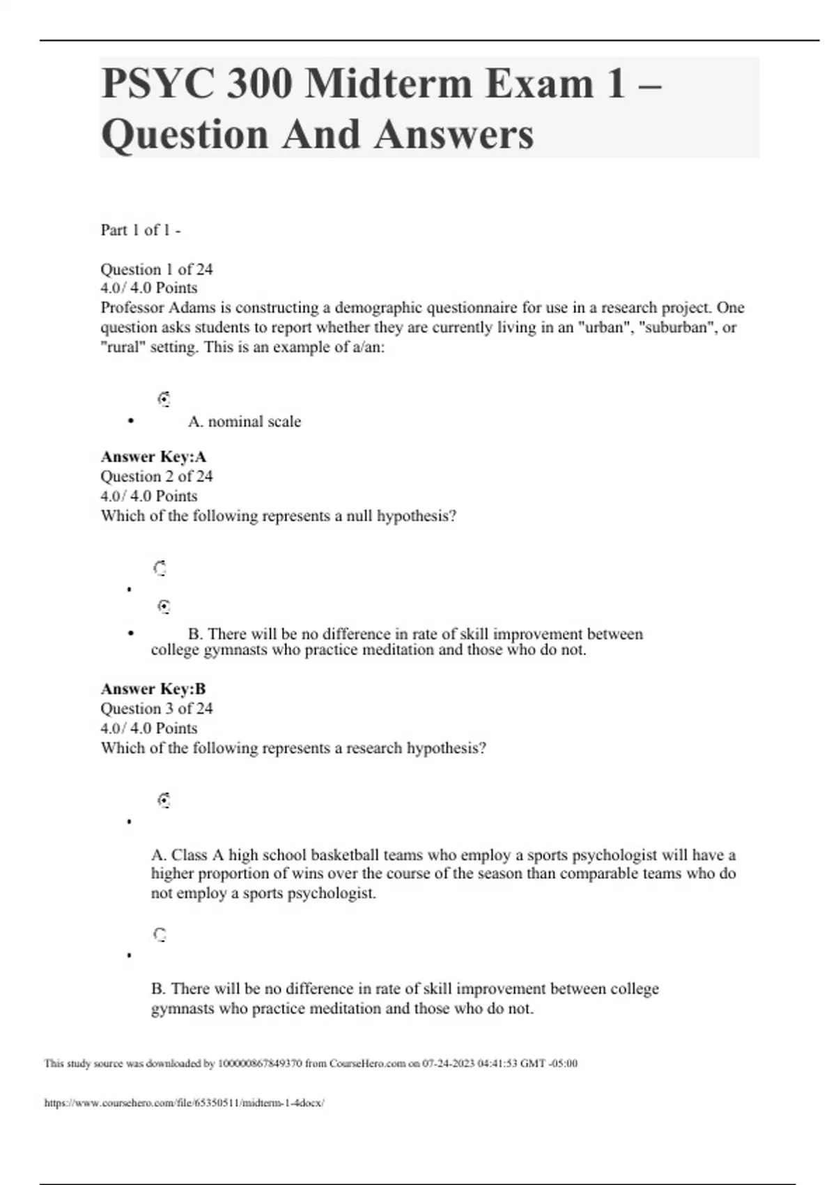 PSYC 300 Midterm Exam 1 – Question And Answers