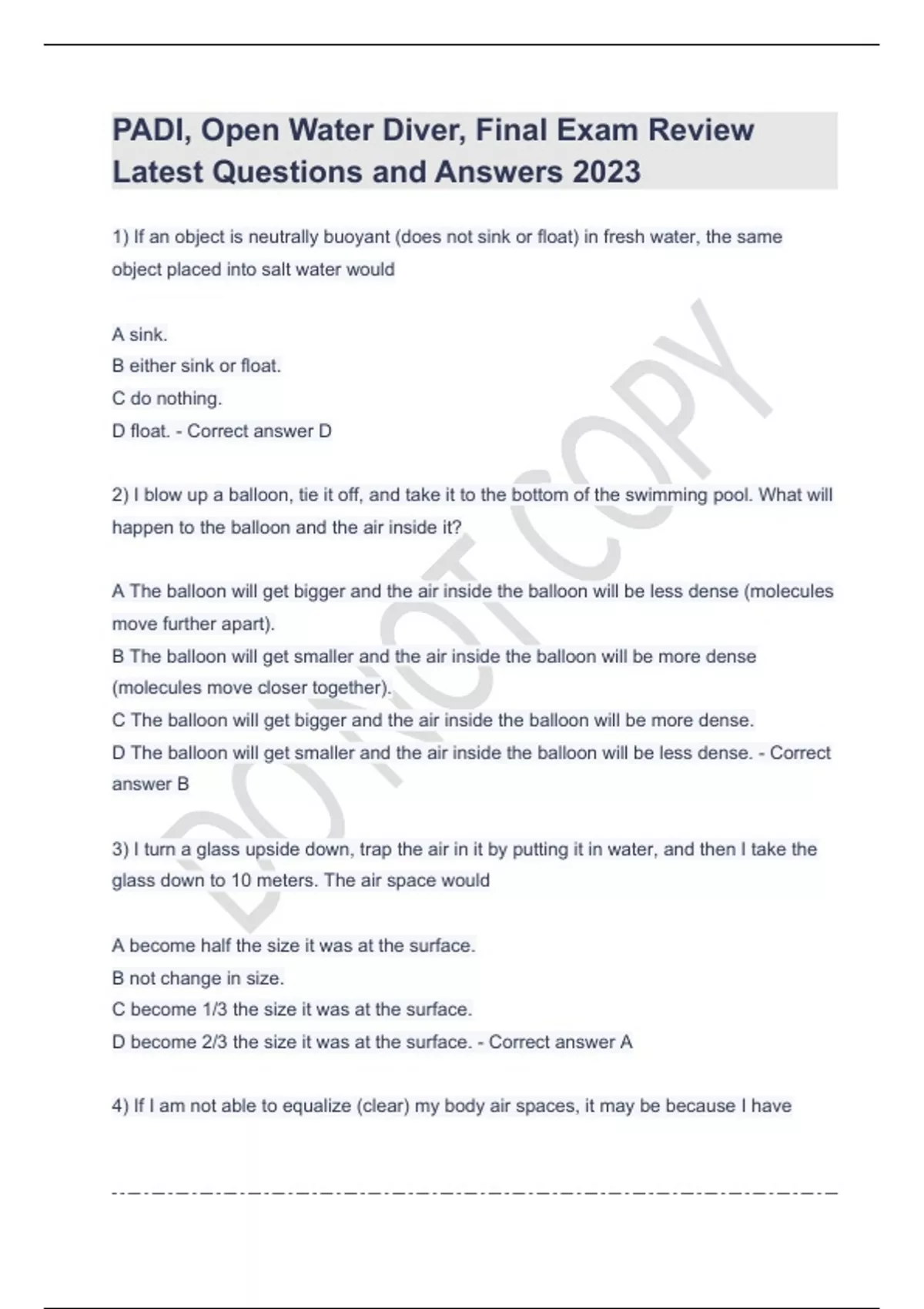 PADI, Open Water Diver, Final Exam Review Latest Questions and Answers 2023