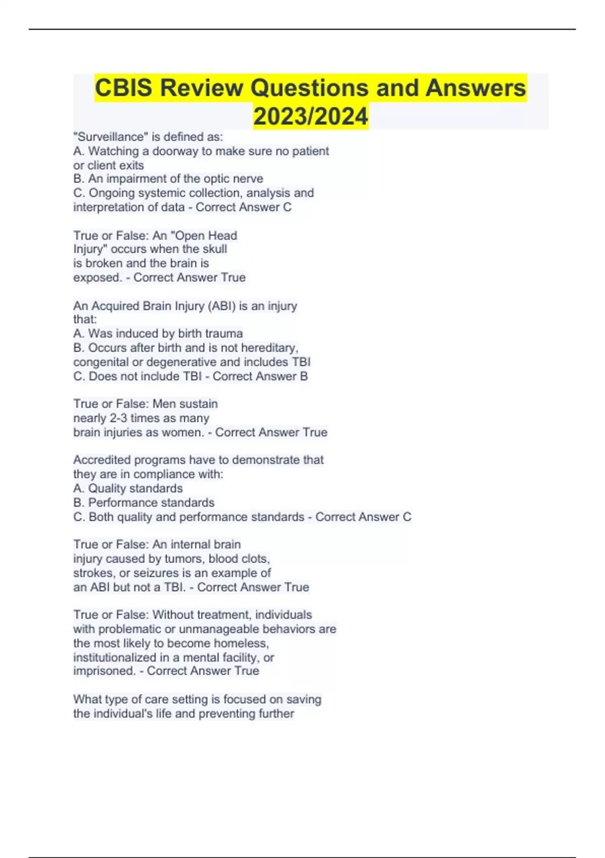 "Surveillance" is defined as: A. Watching a doorway to make sure no patient or client exits B. An impairment of the optic nerve C. Ongoing systemic collection, analysis and interpretation of data - Correct Answer C True or False: An "Open Head Injury" occurs when the skull is broken and the brain is exposed. - Correct Answer True An Acquired Brain Injury (ABI) is an injury that: A. Was induced by birth trauma B. Occurs after birth and is not hereditary, congenital or degenerative and includes TBI C. Does not include TBI - Correct Answer B True or False: Men sustain nearly 2-3 times as many brain injuries as women. - Correct Answer True Accredited programs have to demonstrate that they are in compliance with: A. Quality standards B. Performance standards C. Both quality and performance standards - Correct Answer C True or False: An internal brain injury caused by tumors, blood clots, strokes, or seizures is an example of an ABI but not a TBI. - Correct Answer True True or False: Without treatment, individuals with problematic or unmanageable behaviors are the most likely to become homeless, institutionalized in a mental facility, or imprisoned. - Correct Answer True What type of care setting is focused on saving the individual's life and preventing further