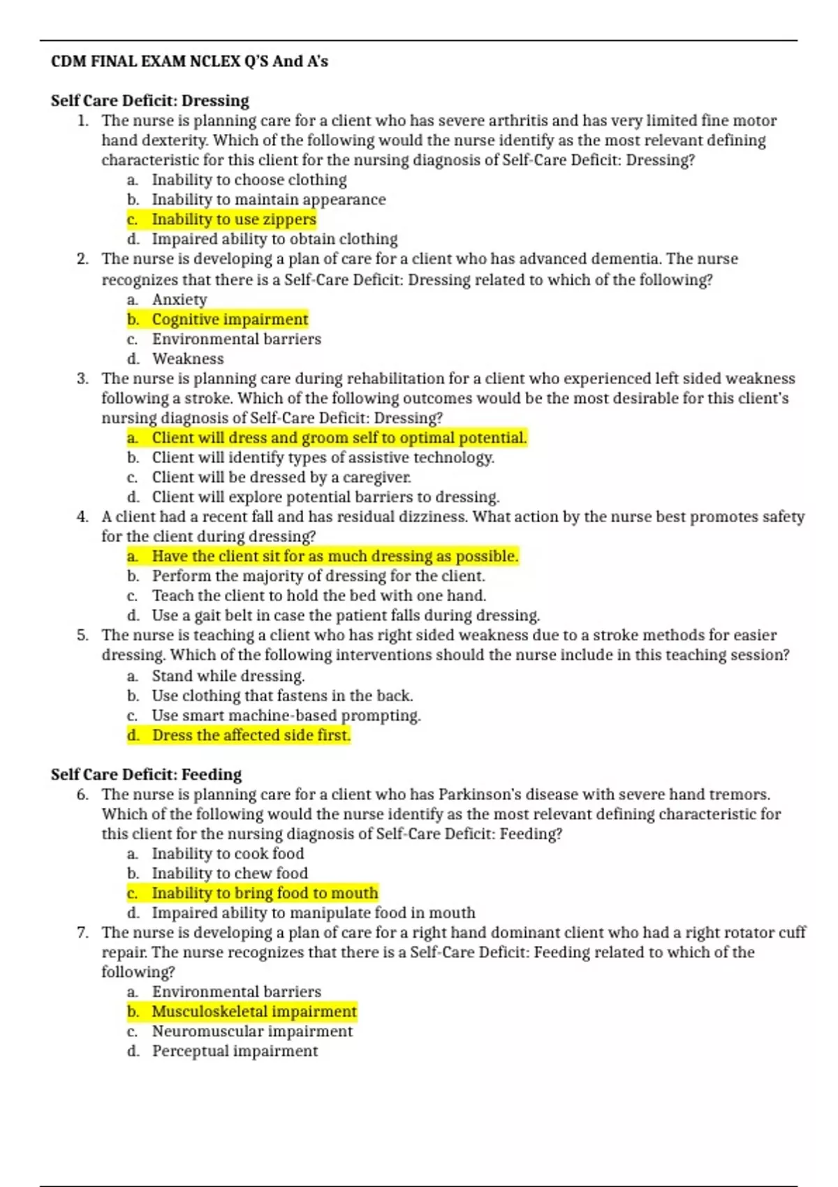 CDM FINAL EXAM NCLEX Q’S And A’s Self Care Deficit: Dressing 1. The nurse is planning care for a client who has severe arthritis and has very limited fine motor hand dexterity. Which of the following would the nurse identify as the most relevant defining characteristic for this client for the nursing diagnosis of Self-Care Deficit: Dressing? a. Inability to choose clothing b. Inability to maintain appearance c. Inability to use zippers d. Impaired ability to obtain clothing 2. The nurse is developing a plan of care for a client who has advanced dementia. The nurse recognizes that there is a Self-Care Deficit: Dressing related to which of the following? a. Anxiety b. Cognitive impairment c. Environmental barriers d. Weakness 3. The nurse is planning care during rehabilitation for a client who experienced left sided weakness following a stroke. Which of the following outcomes would be the most desirable for this client’s nursing diagnosis of Self-Care Deficit: Dressing? a. Client will dress and groom self to optimal potential. b. Client will identify types of assistive technology. c. Client will be dressed by a caregiver. d. Client will explore potential barriers to dressing. 4. A client had a recent fall and has residual dizziness. What action by the nurse best promotes safety for the client during dressing? a. Have the client sit for as much dressing as possible. b. Perform the majority of dressing for the client. c. Teach the client to hold the bed with one hand. d. Use a gait belt in case the patient falls during dressing. 5. The nurse is teaching a client who has right sided weakness due to a stroke methods for easier dressing. Which of the following interventions should the nurse include in this teaching session? a. Stand while dressing. b. Use clothing that fastens in the back. c. Use smart machine-based prompting. d. Dress the affected side first. Self Care Deficit: Feeding 6. The nurse is planning care for a client who has Parkinson’s disease with severe hand tremors. Which of the following would the nurse identify as the most relevant defining characteristic for this client for the nursing diagnosis of Self-Care Deficit: Feeding? a. Inability to cook food b. Inability to chew food c. Inability to bring food to mouth d. Impaired ability to manipulate food in mouth 7. The nurse is developing a plan of care for a right hand dominant client who had a right rotator cuff repair. The nurse recognizes that there is a Self-Care Deficit: Feeding related to which of the following? a. Environmental barriers b. Musculoskeletal impairment c. Neuromuscular impairment d. Perceptual impairment8. The nurse is planning care for a client who is left hand dominant and is experiencing right sided weakness and a frequent cough following a stroke. Which of the following outcomes would be the most desirable for this client’s nursing diagnosis of Self-Care Deficit: Feeding? a. Client will feed self safely. b. Client will identify assistive technology for feeding. c. Client will use adaptive utensils for feeding. d. Client will explore potential barriers to feeding. 9. The nurse is providing a training session for the staff who participates in assisting clients with eating. Which of the following timeframes should the nurse convey is needed per client meal to promote weight gain in at risk clients? a. 10 minutes b. 13 minutes c. 20 minutes d. 42 minutes 10. The nurse is planning care for a client receiving a tube feeding. Which one of the following interventions for the client should the nurse include for safety to help prevent aspiration pneumonia? a. Swab mouth once each shift with foam toothettes. b. Provide regular oral care using toothbrush. c. Avoid oral care to reduce oral secretions d. Apply moisturizer to lips every 4 hours. Self Care Deficit: Toileting 11. During assessment the nurse identifies that a client needs assistance with ambulation. Which of the following would the nurse identify as the most relevant defining characteristic for this client’s nursing diagnosis Self-Care Deficit: Toileting? a. Inability to manipulate clothing for toileting b. Inability to get to toilet or commode c. Inability to wash hands after toileting d. Inability to carry out proper toilet hygiene 12. The nurse is developing a plan of care for a client who uses a wheelchair and requires toileting assistance. The nurse recognizes that there is a Self-Care Deficit: Toileting related to which of the following? a. Impaired transfer ability b. Environmental factors c. Fatigue d. Decreased motivation 13. The nurse is planning care for a client who experienced a traumatic amputation of the right arm. Which of the following outcomes would be most applicable for this client’s nursing diagnosis of Self-Care Deficit: Toileting? a. Client will toilet safely. b. Client will state satisfaction with ability to use adaptive devices for toileting. c. Client will toilet with assistance of caregiver. d. Client will wear adult incontinence briefs for safety 14. The nurse is planning to place a client with a fractured hip on a bed pan. Which one of the following interventions has research shown would be most effective in reducing the client’s anxiety about its use? a. Placing waterproof pads on bed. b. Provide analgesics 30 minutes after bed pan use. c. Warm bedpan with hot water. d. Discuss use of bed pan with client prior to its use.15. A nurse is caring for a hospitalized client with urinary frequency. What action by the nurse best promotes patient safety? a. Assess the client’s fall risk with a standardized tool. b. Obtain a prescription for an indwelling catheter. c. Provide a bedside commode for the client to use. d. Remind the client to get assistance with toileting. Readiness for enhanced comfort; comfort, impaired 1. A nurse is caring for a client with the diagnosis of Readiness for Enhanced Comfort. Which of the following Nursing Outcomes Classification (NOC) outcomes would be inconsistent with the nurse’s kn