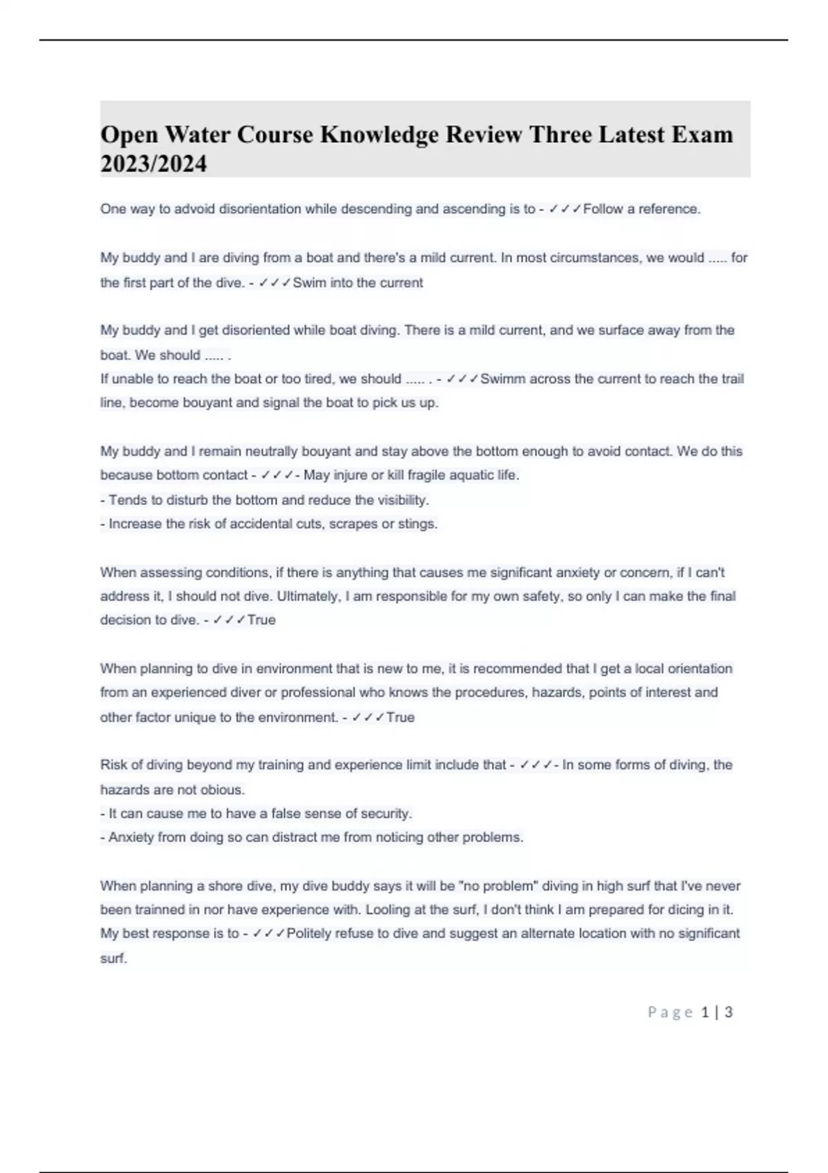 Open Water Course Knowledge Review Three Latest Exam 2023/2024