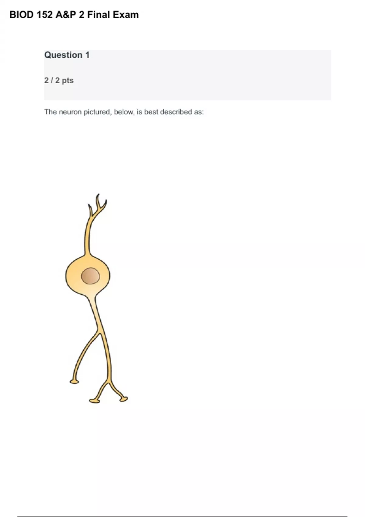 The neuron pictured, below, is best described as: BIOD 152 A&P 2 Final Exam Correct! Bipolar It has two extensions from the central cell body. Multipolar Unipolar Pseudounipolar Question 2 Not yet graded / 10 pts Name and describe what is occurring in the neuron cell membrane in section 2 of the diagram. Include the charge of the membrane during this phase. ● Depolarization: The sodium gates open and sodium rushes into the axon during the depolarization phase of the action potential. ● Voltage travels past zero and then on up to +40 mV.