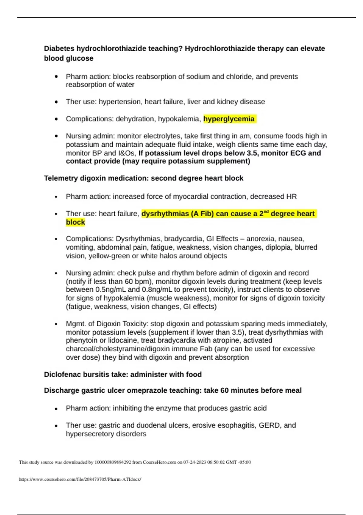 Diabetes hydrochlorothiazide teaching? Hydrochlorothiazide therapy can elevate blood glucose Pharm action: blocks reabsorption of sodium and chloride, and prevents reabsorption of water Ther use: hypertension, heart failure, liver and kidney disease Complications: dehydration, hypokalemia, hyperglycemia Nursing admin: monitor electrolytes, take first thing in am, consume foods high in potassium and maintain adequate fluid intake, weigh clients same time each day, monitor BP and I&Os, If potassium level drops below 3.5, monitor ECG and contact provide (may require potassium supplement) Telemetry digoxin medication: second degree heart block Pharm action: increased force of myocardial contraction, decreased HR Ther use: heart failure, dysrhythmias (A Fib) can cause a 2nd degree heart block Complications: Dysrhythmias, bradycardia, GI Effects – anorexia, nausea, vomiting, abdominal pain, fatigue, weakness, vision changes, diplopia, blurred vision, yellow-green or white halos around objects Nursing admin: check pulse and rhythm before admin of digoxin and record (notify if less than 60 bpm), monitor digoxin levels during treatment (keep levels between 0.5ng/mL and 0.8ng/mL to prevent toxicity), instruct clients to observe for signs of hypokalemia (muscle weakness), monitor for signs of digoxin toxicity (fatigue, weakness, vision changes, GI effects) Mgmt. of Digoxin Toxicity: stop digoxin and potassium sparing meds immediately, monitor potassium levels (supplement if lower than 3.5), treat dysrhythmias with phenytoin or lidocaine, treat bradycardia with atropine, activated charcoal/cholestyramine/digoxin immune Fab (any can be used for excessive over dose) they bind with digoxin and prevent absorption Diclofenac bursitis take: administer with food Discharge gastric ulcer omeprazole teaching: take 60 minutes before meal Pharm action: inhibiting the enzyme that produces gastric acid Ther use: gastric and duodenal ulcers, erosive esophagitis, GERD, and hypersecretory disorders