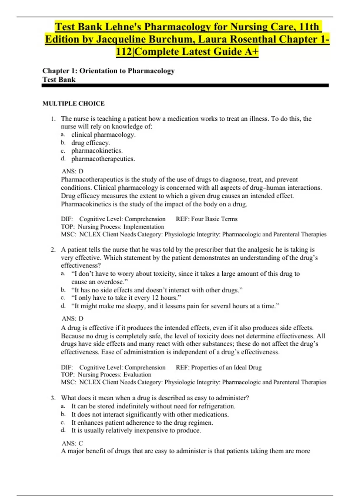 Test Bank Lehne's Pharmacology for Nursing Care, 11th Edition by Jacqueline Burchum, Laura Rosenthal Chapter 1-112|Complete Latest Guide A+ 1.The nurse is teaching a patient how a medication works to treat an illness. To do this, the nurse will rely on knowledge of: cal pharmacology. efficacy. acokinetics. acotherapeutics. ANS: D Pharmacotherapeutics is the study of the use of drugs to diagnose, treat, and prevent conditions. Clinical pharmacology is concerned with all aspects of drug–human interactions. Drug efficacy measures the extent to which a given drug causes an intended effect. Pharmacokinetics is the study of the impact of the body on a drug. DIF: Cognitive Level: Comprehension REF: Four Basic Terms TOP: Nursing Process: Implementation MSC: NCLEX Client Needs Category: Physiologic Integrity: Pharmacologic and Parenteral Therapies 2.A patient tells the nurse that he was told by the prescriber that the analgesic he is taking is very effective. Which statement by the patient demonstrates an understanding of the drug’s effectiveness? a.“I don’t have to worry about toxicity, since it takes a large amount of this drug to cause an overdose.” b.“It has no side effects and doesn’t interact with other drugs.” c.“I only have to take it every 12 hours.” d.“It might make me sleepy, and it lessens pain for several hours at a time.” ANS: D A drug is effective if it produces the intended effects, even if it also produces side effects. Because no drug is completely safe, the level of toxicity does not determine effectiveness. All drugs have side effects and many react with other substances; these do not affect the drug’s effectiveness. Ease of administration is independent of a drug’s effectiveness. DIF: Cognitive Level: Comprehension REF: Properties of an Ideal Drug TOP: Nursing Process: Evaluation MSC: NCLEX Client Needs Category: Physiologic Integrity: Pharmacologic and Parenteral Therapies