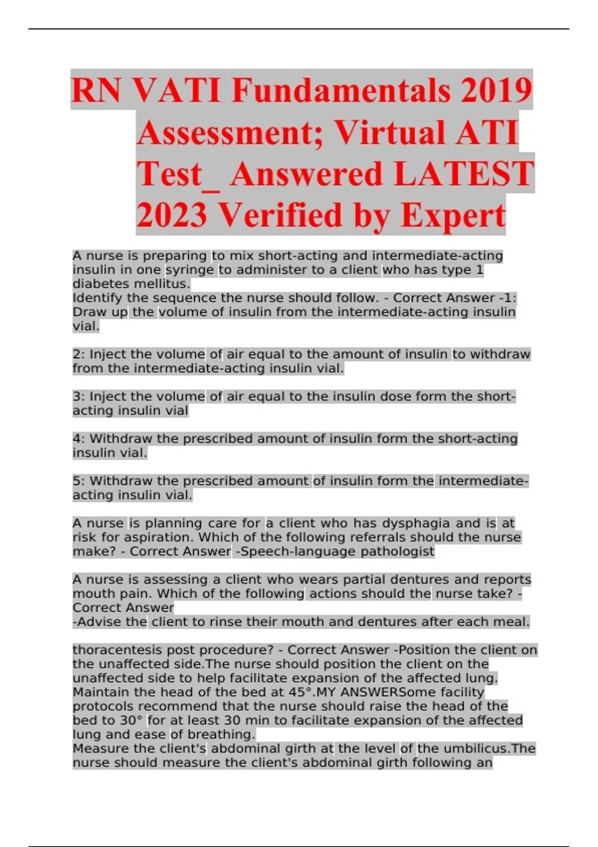 RN VATI Fundamentals 2019 Assessment; Virtual ATI Test_ Answered Fall 2023. A nurse is preparing to mix short-acting and intermediate-acting insulin in one syringe to administer to a client who has type 1 diabetes mellitus. Identify the sequence the nurse should follow. A nurse is assessing a client who wears partial dentures and reports mouth pain. Which of the following actions should the nurse take? A nurse is planning care for a client who has dysphagia and is at risk for aspiration. Which of the following referrals should the nurse make? thoracentesis post procedure? A nurse is planning teaching for a client who has a new diagnosis of type 2 diabetes mellitus. Which of the following actions should the nurse take prior to performing the teaching? (select all that apply) A nurse is preparing to notify the provider about