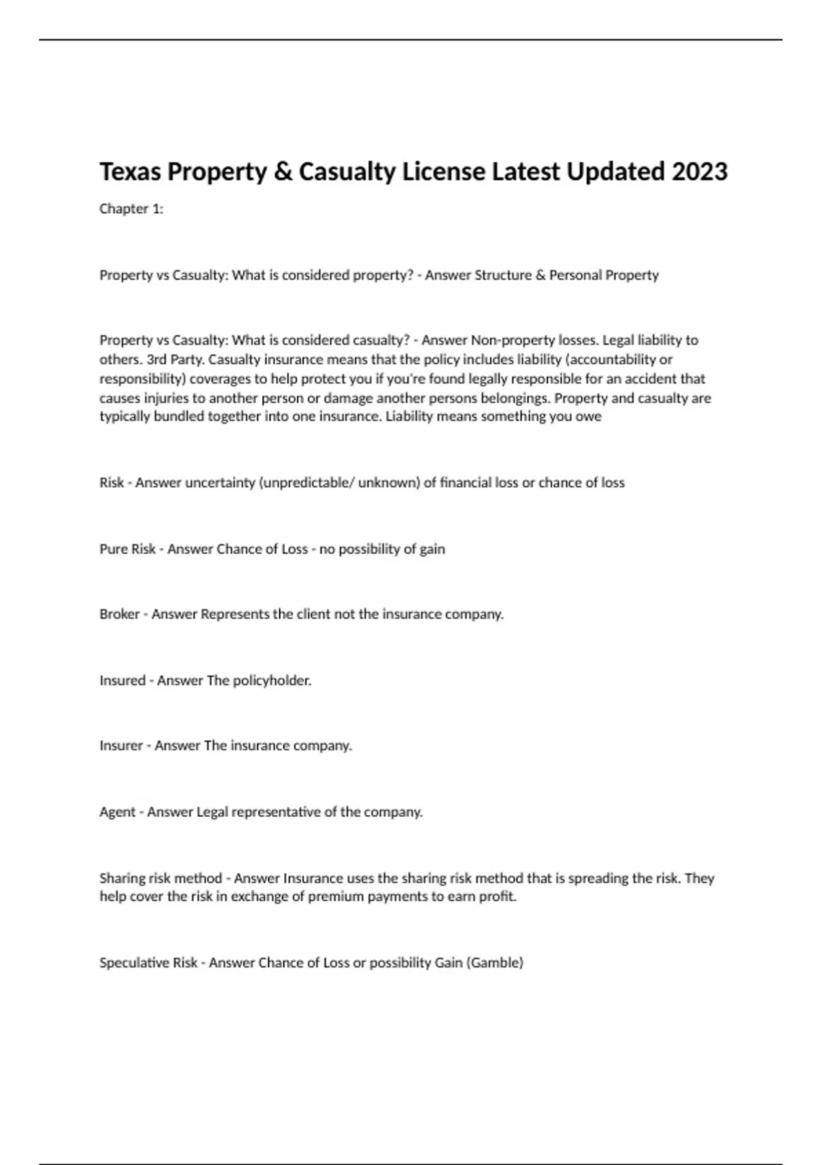 Chapter 1: Property vs Casualty: What is considered property? - Answer Structure & Personal Property Property vs Casualty: What is considered casualty? - Answer Non-property losses. Legal liability to others. 3rd Party. Casualty insurance means that the policy includes liability (accountability or responsibility) coverages to help protect you if you're found legally responsible for an accident that causes injuries to another person or damage another persons belongings. Property and casualty are typically bundled together into one insurance. Liability means something you owe Risk - Answer uncertainty (unpredictable/ unknown) of financial loss or chance of loss Pure Risk - Answer Chance of Loss - no possibility of gain Broker - Answer Represents the client not the insurance company. Insured - Answer The policyholder. Insurer - Answer The insurance company. Agent - Answer Legal representative of the company. Sharing risk method - Answer Insurance uses the sharing risk method that is spreading the risk. They help cover the risk in exchange of premium payments to earn profit. Speculative Risk - Answer Chance of Loss or possibility Gain (Gamble) Insurance (covers which type of risk?) - Answer Pure Risk Only How does the law of large numbers apply in insurance? - Answer Actuaries use the law of large numbers to estimate claims Risk Management Techniques - Answer 1. Risk Avoidance: staying away from risky activities 2. Risk Reduction: taking measures to reduce risk 3. Risk Retention: build up a fund 4. Risk Shifting: getting someone to accept the risk. 5. Buying insurance: obvious ways to manage risk is to buy insurance. What is the law of large numbers? - Answer as the number of a similar loss exposure increases, the more accurate claims can be predicted from the group. *Large numbers : losses become more predictable as the # of insureds increase. What is the purpose of insurance? - Answer to idemnify by making the insured whole, not have them come out ahead. What is an insurance? - Answer A contract, transfer of risk and social device. client agrees to incur a small immediate loss in exchange for protection against the potential of a large future loss. Indemnification - Answer insurance policy is meant to make the insured whole after suffering a loss. What characteristics must be met for insurance companies to insure economic losses? - Answer predictable, accidental, measurable, non-catastrophic. Types of insurance - Answer 1)stock companies: owned by stockholders. board of directors to protect. Non-participating. 2)Mutual companies: owned by policyholders. Participating. 3) Reciprocal Companies: Attorney-in-fact- a person in charge. Cooperative. Hospitals use this type of insurance. 4) Fraternal benefit societies: common ethnic, religion, charitable heritage. lutherans. 5) Government insurers: medicare, medicaid. U.S. runs world largest insurance org, 6) Insurance Regulation: NAIC national association of insurance commission. provide uniformity to insurance laws and regulations. Insurance Regulation - Answer most regulation is done at the state level, not at the federal level. Chapter 2: What is a peril? - Answer cause of loss wind, hail, fire, smoke. The more you ask to cover, the more expensive the policy is. underwriters - Answer review policy applications and determines whether the applications are acceptable. Actuaries - Answer mountains of data about people of specified age, gender, occupation, avocation. field underwriters - Answer insurance agents What is a hazard? - Answer things that increase the chance of a peril happening. factors that increase the chance of loss occuring. The more risk the less likely you qualify to be insured or if there are many risks you pay more. Three types of hazards - Answer 1)Physical: visible characteristic (dead tree, faulty wiring,worn tires,slippery floors, loose handrail; the more physical the higher the premium) 2)Moral: Dishonest tendencies (people will try to do intentional things like letting something burn on purpose) 3) Morale: Attitude of carelessness (someone who doesnt care, they will pay more because they are more prone to risk) insurable interest - Answer financial interest one has if a loss occurs. owner has insurable interest in his own property but not in their tenant's property. vice versa. Limit of liability - Answer max amount of pay the insurer must pay for the loss. deductible - Answer the portion of the loss that the insured must absorb before the insurance company begins to pay. $250. This gets taken away from the cost of damage to see how much insurance will have to pay. deductible reduces morale and moral hazards. Raising the deductible lowers the premium. Deductible does not uphold the principle of indemnification because you are paying this portion. side mirror: damage $200 deductible $250 insurer pays $0 trunk: damage $300 deductible $250 insurer pays $50 per-loss deductible - Answer insured may agree to be responsible for all liability claims under $100,000 and the insurer will cover the balance. other insurance clause - Answer States that if a person has more than one insurance policy on a property, each company is liable for only a prorated amount of the loss. cannot use other insurances to recover double it has to be portionate, a whole. This upholds the principle of indemnification. endorsement - Answer or rider, extension. An addition to the policy. it can add or subtract coverage. How many of the insureds must agree to a change in the policy? - Answer only the first named insured who controls the policy. What are the two types of termination of a policy? - Answer Cancellation - occurs when the insured/insurer cancels the contract before the end of the policy period. Non-Renewals - occurs at the end of the policy period. assignment - Answer transfer of a policy to a new policy. must be agreed in writing by the old policy owner, the new policy owner and the insurance company. nonrenewal - Answer A termination of a polic