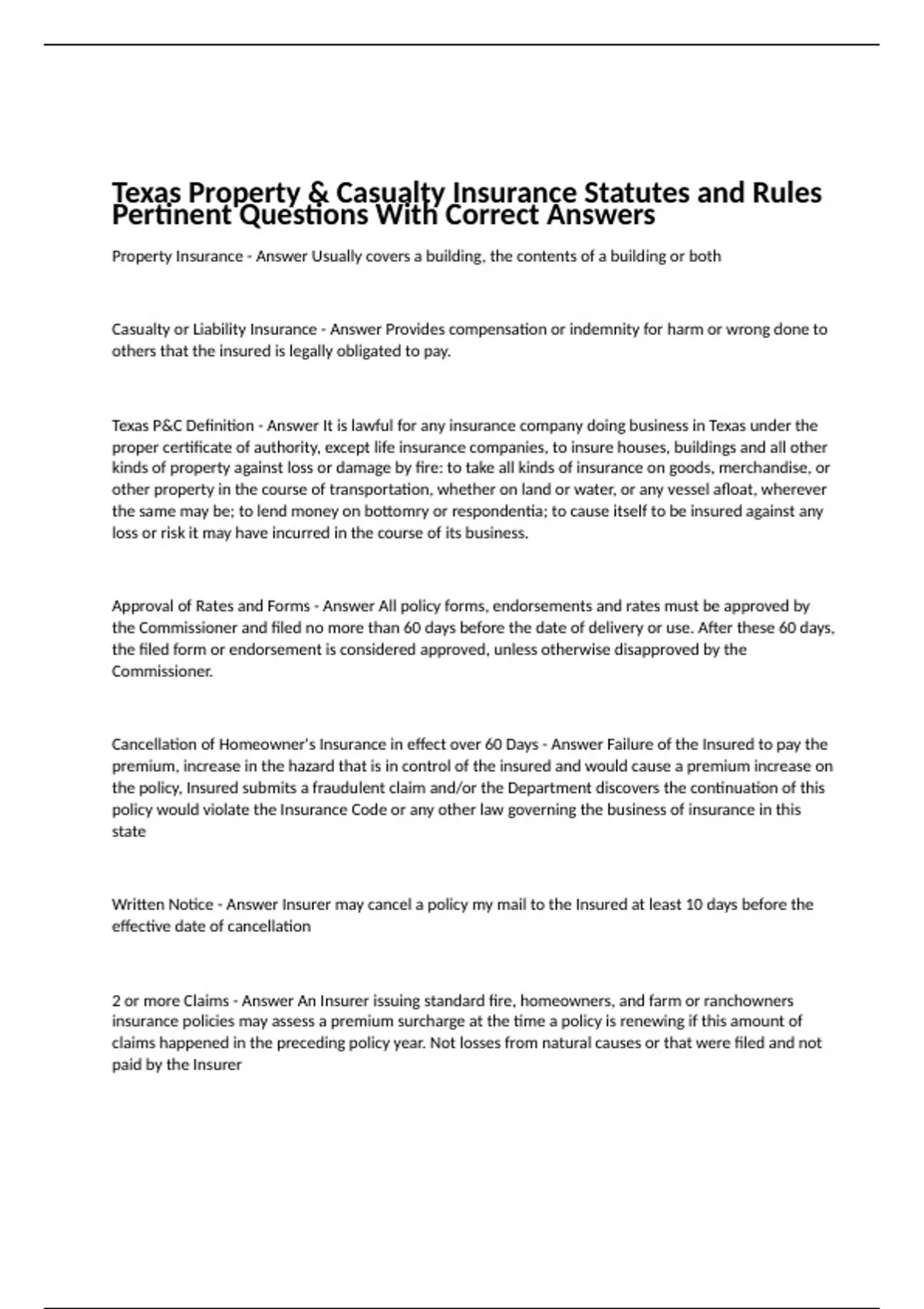 Texas Property & Casualty Insurance Statutes and Rules Pertinent Questions With Correct Answers