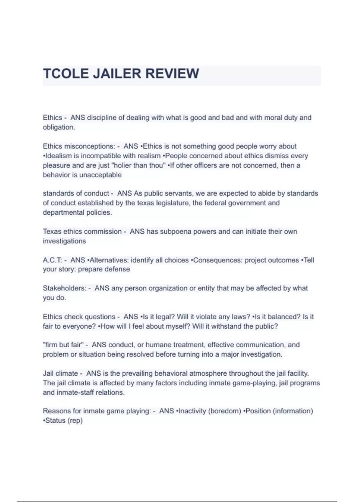 TCOLE Practice Jailer Exam Latest Set Questions & Answers Bundled Here (A+ GRADED 100% VERIFIED)