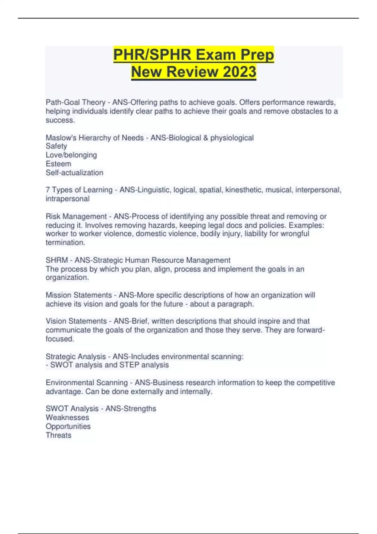 PHR/SPHR Exam Prep New Review 2023 Path-Goal Theory - ANS-Offering paths to achieve goals. Offers performance rewards, helping individuals identify clear paths to achieve their goals and remove obstacles to a success. Maslow's Hierarchy of Needs - ANS-Biological & physiological Safety Love/belonging Esteem Self-actualization 7 Types of Learning - ANS-Linguistic, logical, spatial, kinesthetic, musical, interpersonal, intrapersonal Risk Management - ANS-Process of identifying any possible threat and removing or reducing it. Involves removing hazards, keeping legal docs and policies. Examples: worker to worker violence, domestic violence, bodily injury, liability for wrongful termination. SHRM - ANS-Strategic Human Resource Management The process by which you plan, align, process and implement the goals in an organization. Mission Statements - ANS-More specific descriptions of how an organization will achieve its vision and goals for the future - about a paragraph. Vision Statements - ANS-Brief, written descriptions that should inspire and that communicate the goals of the organization and those they serve. They are forwardfocused. Strategic Analysis - ANS-Includes environmental scanning: - SWOT analysis and STEP analysis Environmental Scanning - ANS-Business research information to keep the competitive advantage. Can be done externally and internally. SWOT Analysis - ANS-Strengths Weaknesses Opportunities Threats STEP Analysis - ANS-Social Technological Economic Political environment Strategic Planning - ANS-Determining where an organization is going over the next year or more and how you are going to get there. Typically organization-wide, but can also include specific units/departments. SMART Goals - ANS-Specific Measurable Attainable Relevant Time-based GAAP - ANS-Generally accepted accounting principles Cultural Intelligence - ANS-Sensitive to cultures other than their own Income Statement - ANS-Composed of revenues, expenses and net income for a given period of time. "Profit and loss statement" Balance Sheet - ANS-Financial picture of an organization at any point in a given time, although typically prepared at the end of the month. Assets = Liability + Capital Progressive Disciplinary Plan - ANS-1. Verbal warning 2. First written warning 3. Final written warning 4. Suspension and termination HPWS - ANS-High Performance Work Systems A set of HR practices that combine work processes that will maximize employee work performance, knowledge and skills, and manage work flow. Project Management - ANS-Process of planning, organizing, managing, and executing a specific assignment that is constrained by time and budget. LPC Scale - ANS-Least Preferred Coworker Scale - High score - leader has a human relation orientation - Low score - leader is more task oriented Fiedlers Contingency Theory - ANS-Group performance is based on the leader's psychological orientation and three additional variables: - Group atmosphere - Task structure - Leader's position of power 4 Styles of Leadership - Continues...