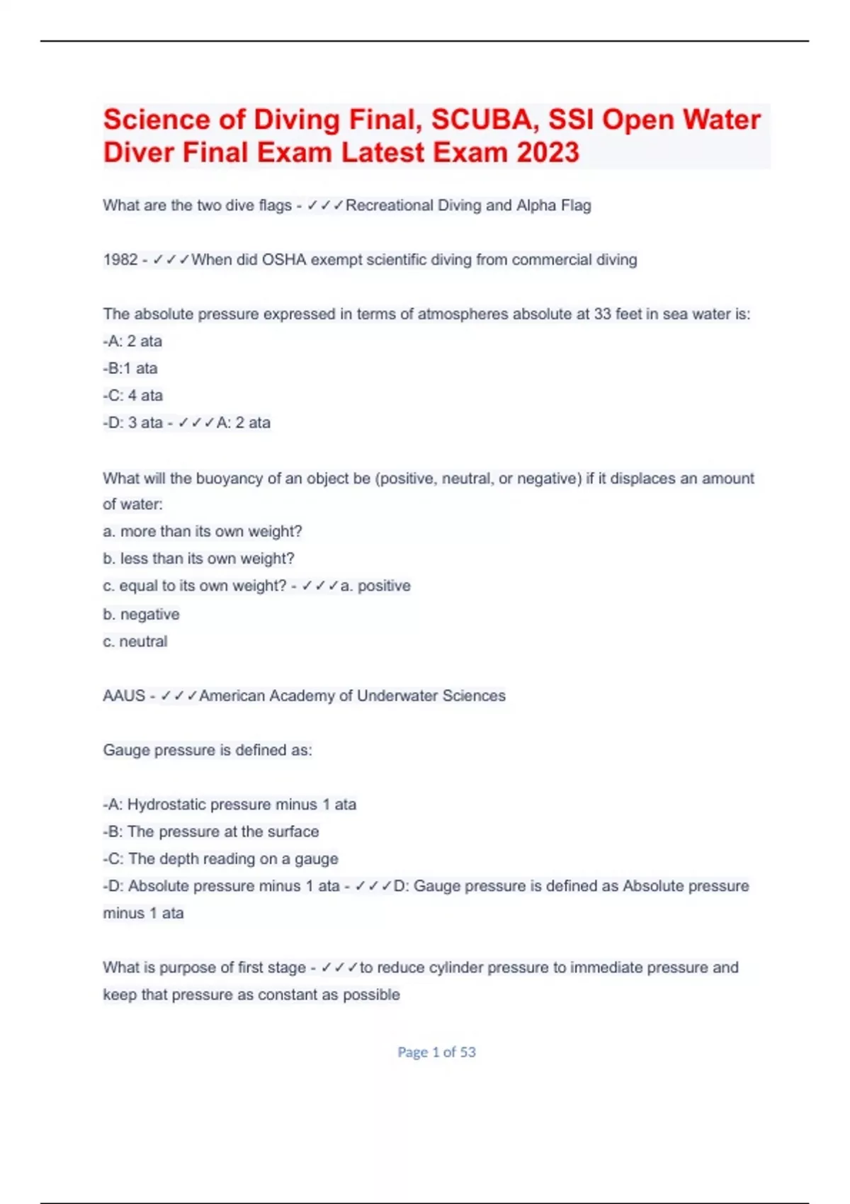 Science of Diving Final, SCUBA, SSI Open Water Diver Final Exam Latest Exam 2023
