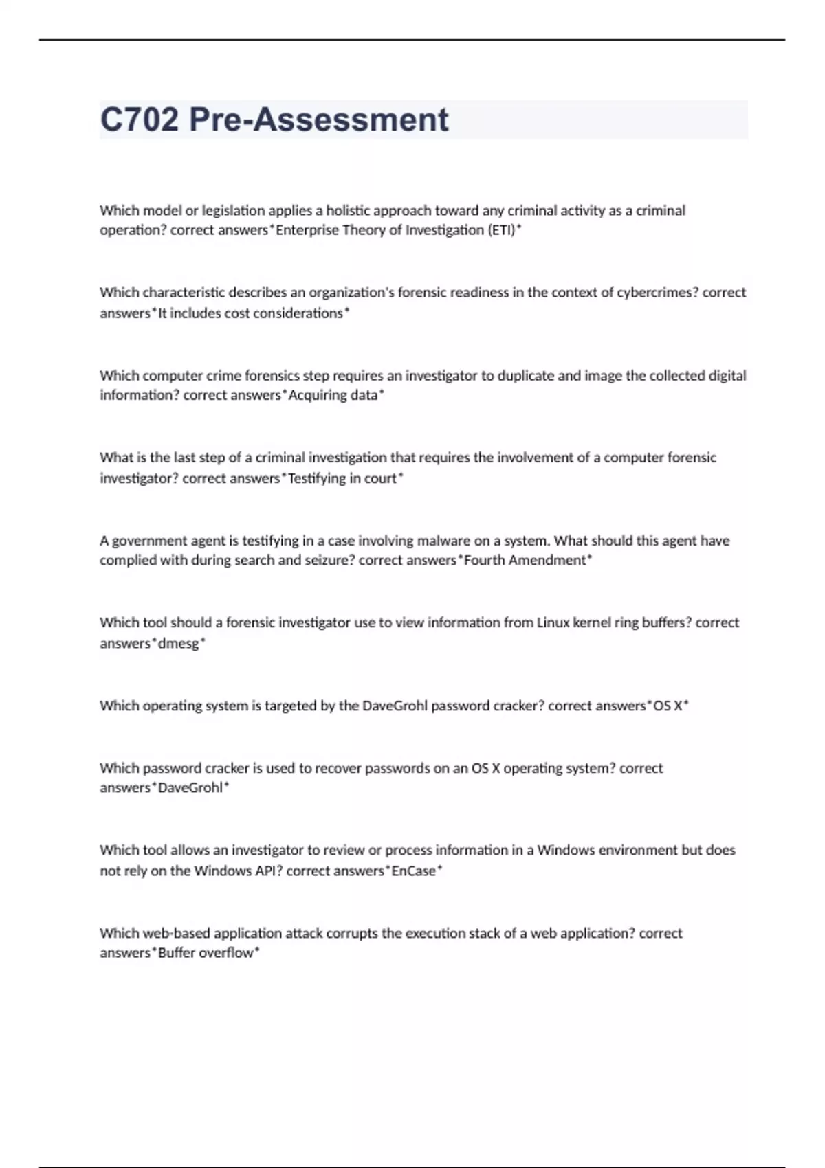 Which model or legislation applies a holistic approach toward any criminal activity as a criminal operation? correct answers*Enterprise Theory of Investigation (ETI)* Which characteristic describes an organization's forensic readiness in the context of cybercrimes? correct answers*It includes cost considerations* Which computer crime forensics step requires an investigator to duplicate and image the collected digital information? correct answers*Acquiring data* What is the last step of a criminal investigation that requires the involvement of a computer forensic investigator? correct answers*Testifying in court* A government agent is testifying in a case involving malware on a system. What should this agent have complied with during search and seizure? correct answers*Fourth Amendment* Which tool should a forensic investigator use to view information from Linux kernel ring buffers? correct answers*dmesg*
