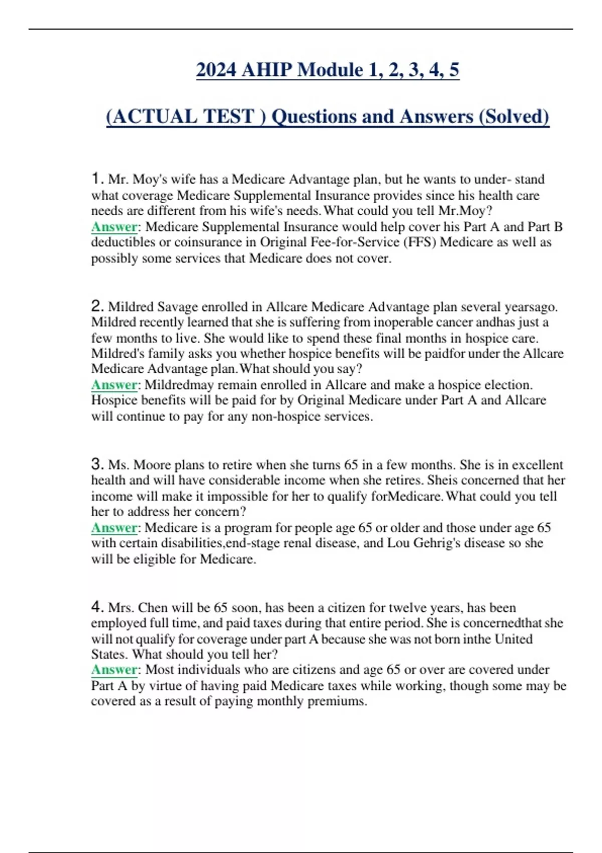 2024 AHIP Module 1, 2, 3, 4, 5 (ACTUAL TEST ) Questions and Answers (Solved) Mr. Moy's wife has a Medicare Advantage plan, but he wants to under- stand what coverage Medicare Supplemental Insurance provides since his health care needs are different from his wife's needs.What could you tell Mr.Moy? Answer: Medicare Supplemental Insurance would help cover his Part A and Part B deductibles or coinsurance in Original Fee-for-Service (FFS) Medicare as well as possibly some services that Medicare does not cover. 2. Mildred Savage enrolled in Allcare Medicare Advantage plan several yearsago. Mildred recently learned thatshe is suffering from inoperable cancer andhas just a few months to live. She would like to spend these final months in hospice care. Mildred's family asks you whether hospice benefits will be paidfor under the Allcare Medicare Advantage plan.Whatshould you say? Answer: Mildredmay remain enrolled in Allcare and make a hospice election. Hospice benefits will be paid for by Original Medicare under Part A and Allcare will continue to pay for any non-hospice services. 3. Ms. Moore plans to retire when she turns 65 in a few months. She is in excellent health and will have considerable income when she retires. Sheis concerned that her income will make it impossible for her to qualify forMedicare.What could you tell her to address her concern? Answer: Medicare is a program for people age 65 or older and those under age 65 with certain disabilities,end-stage renal disease, and Lou Gehrig's disease so she will be eligible for Medicare. 4. Mrs. Chen will be 65 soon, has been a citizen for twelve years, has been employed full time, and paid taxes during that entire period. She is concernedthatshe will not qualify for coverage under part A because she was not born inthe United States. What should you tell her? Answer: Most individuals who are citizens and age 65 or over are covered under Part A by virtue of having paid Medicare taxes while working, though some may be covered as a result of paying monthly premiums. 5. Mr. Capadona would like to purchase a Medicare Advantage (MA) plan and a Medigap plan to pick up costs not covered by that plan.What should you tellhim? Answer: It is illegal for you to sell Mr.Capadona a Medigap plan if he is enrolled in anMA plan, and besides, Medigap only works with Original Medicare.