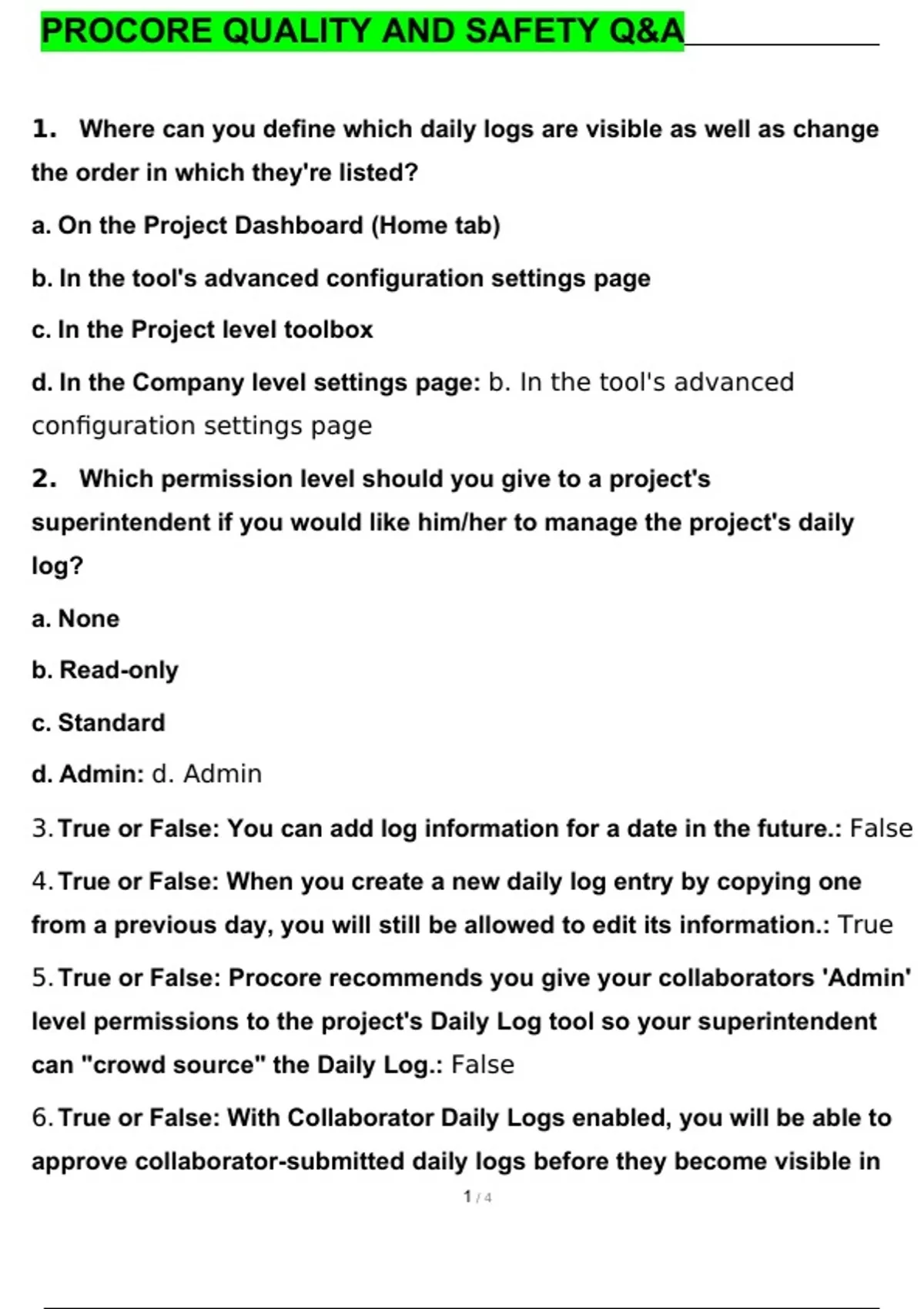 5.True or False: Procore recommends you give your collaborators 'Admin' level permissions to the project's Daily Log tool so your superintendent can "crowd source" the Daily Log.: False