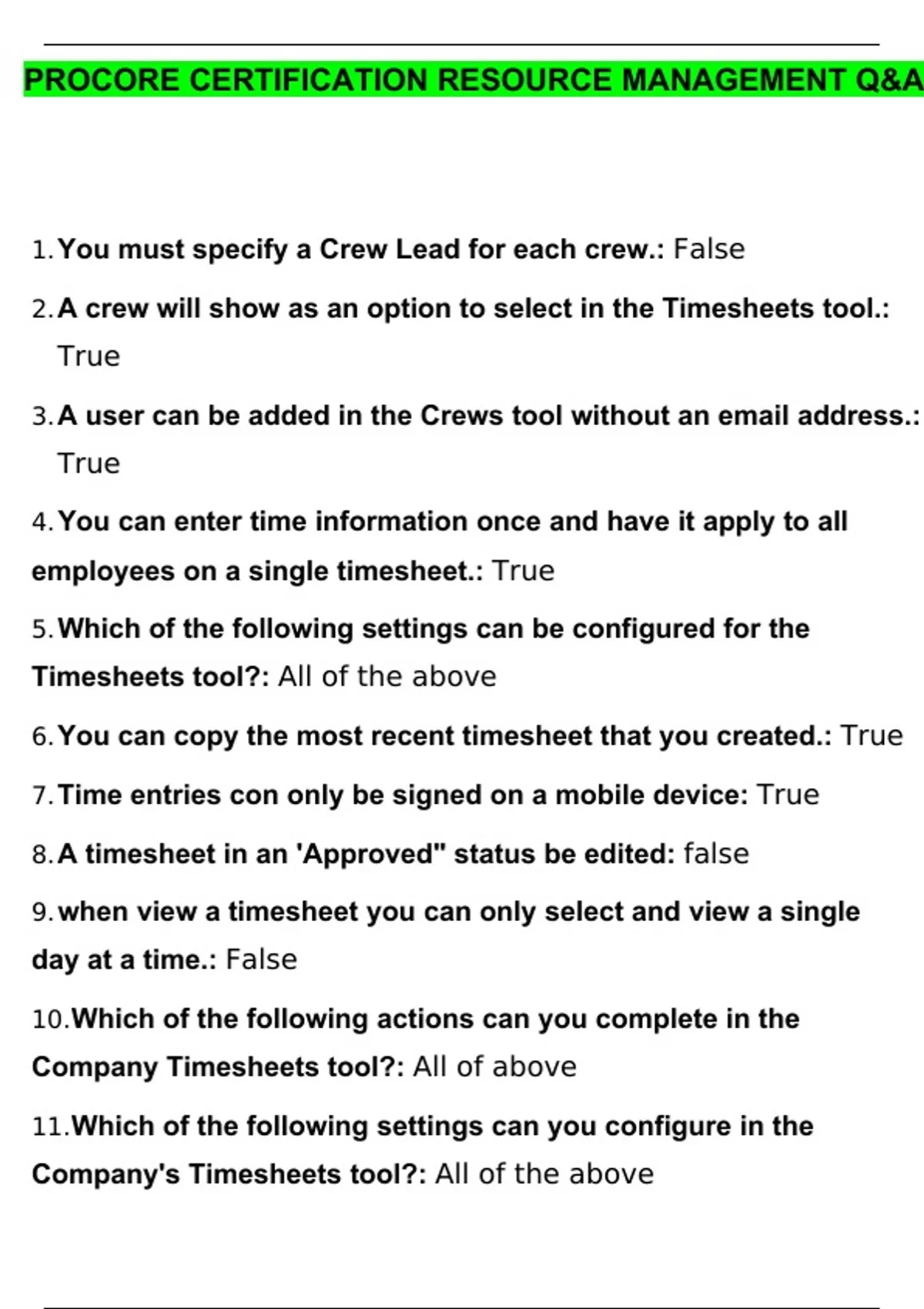PROCORE CERTIFICATION RESOURCE MANAGEMENT EXAM QUESTIONS AND ANSWERS GRADED A+