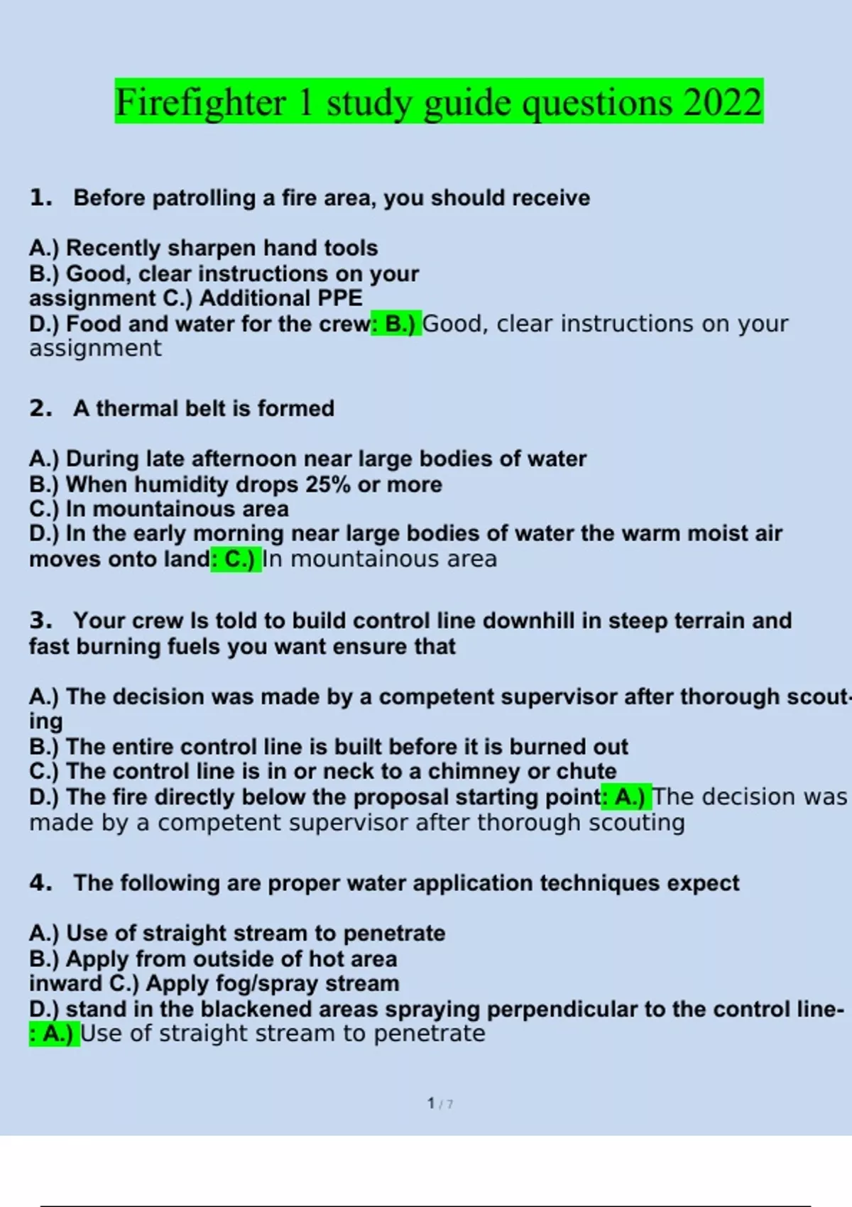 1. Before patrolling a fire area, you should receive A.) Recently sharpen hand tools B.) Good, clear instructions on your assignment C.) Additional PPE D.) Food and water for the crew: B.) Good, clear instructions on your assignment 2. A thermal belt is formed A.) During late afternoon near large bodies of water B.) When humidity drops 25% or more C.) In mountainous area D.) In the early morning near large bodies of water the warm moist air moves onto land: C.) In mountainous area 3. Your crew Is told to build control line downhill in steep terrain and fast burning fuels you want ensure that A.) The decision was made by a competent supervisor after thorough scout- ing B.) The entire control line is built before it is burned out C.) The control line is in or neck to a chimney or chute D.) The fire directly below the proposal starting point: A.) The decision was made by a competent supervisor after thorough scouting 4. The following are proper water application techniques expect A.) Use of straight stream to penetrate B.) Apply from outside of hot area inward C.) Apply fog/spray stream D.) stand in the blackened areas spraying perpendicular to the control line- : A.) Use of straight stream to penetrate